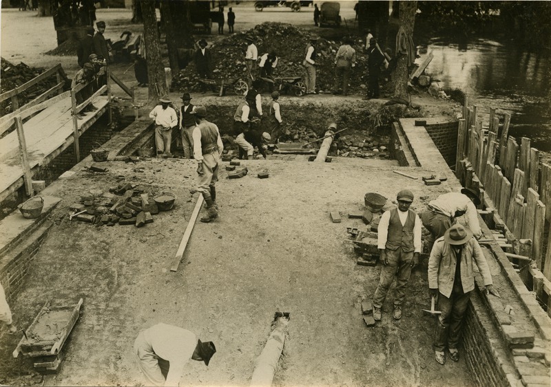 Operai a lavoro lungo l'argine di un fiumePantalena Volpe