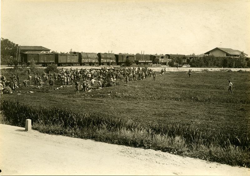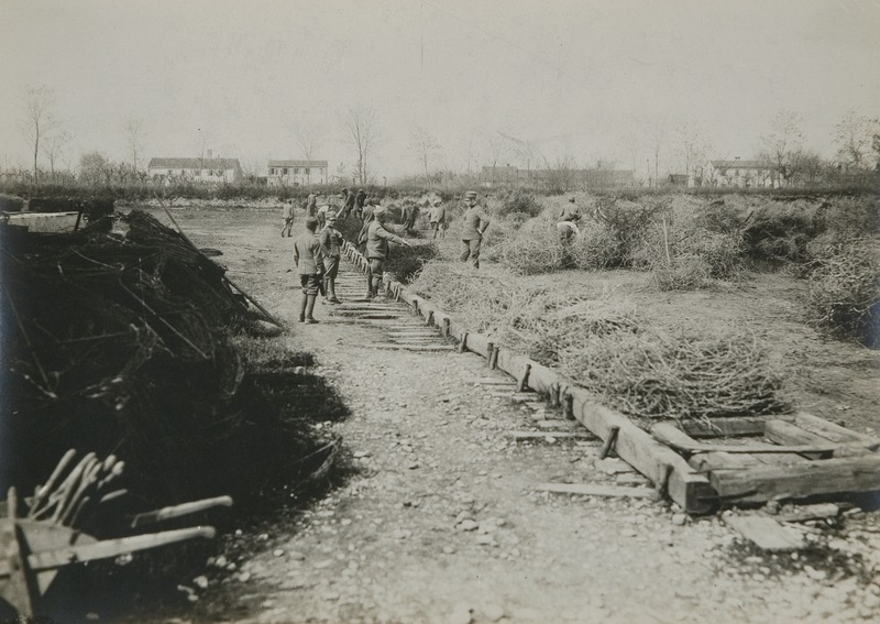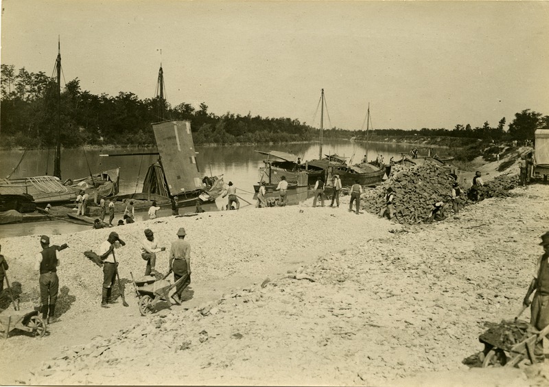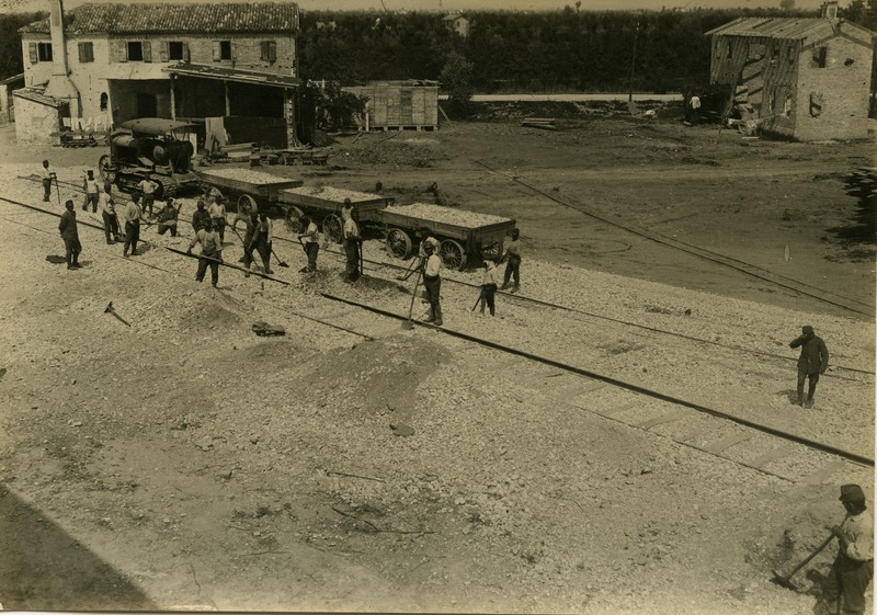 Fossalta di Piave - Operai del Genio Militare caricano ghiaia alla stazione ferroviariaPantalena Volpe