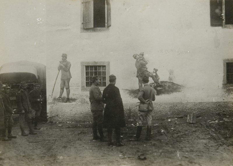 Ufficiali guardano un murale con Il Primo saluto e Il più bel Zappatore della CompagniaPantalena Volpe