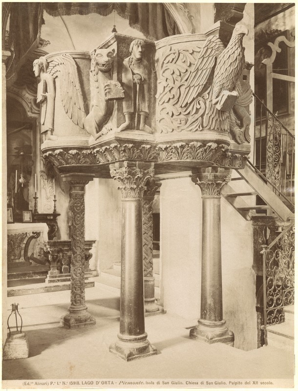 Orta San Giulio, Isola di San Giulio – Basilica di San Giulio, Pulpito, dopo l'integrazione della quarta colonna Fratelli AlinariArchivio MPI (Ministero della Pubblica Istruzione)