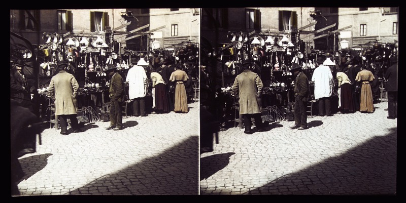 Roma - Campo de' Fiori, il mercato nella piazza con una bancarella con pentole, pignatte e bagagliLe Lieure, HenriLe Lieure