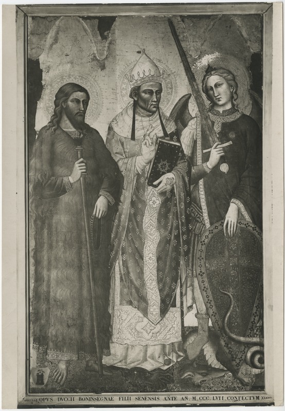 Pisa - Cattedrale di S. Maria Assunta o Duomo oggi al Museo Nazionale di S. Matteo, trittico, pannello sinistro, santo vescovo tra arcangelo Gabriele e S. Giovanni BattistaCarboni, C.Archivio MPI (Ministero della Pubblica Istruzione)