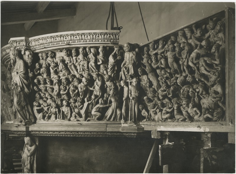 Pisa - Deposito attiguo alla Cattedrale, pulpito, il Giudizio finale durante le prove di ricollocazioneCarboni, C.Archivio MPI (Ministero della Pubblica Istruzione)