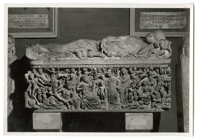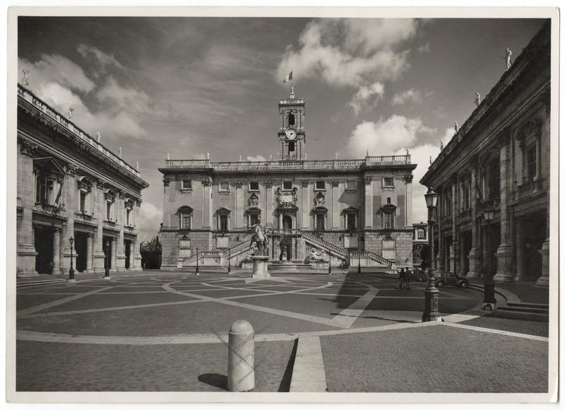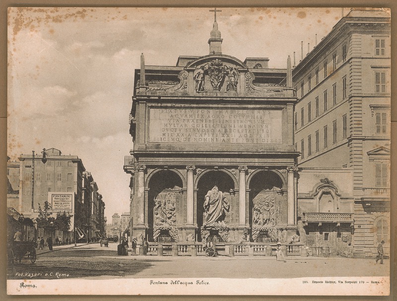 Roma - Fontane; Roma - Fontana del Mosè. Esterno/giorno: al centro dellinquadratura la grande fontana del Mosé (id eata da D. Fontana nel 1587-88 come mostra dell'acquedotto Felice), con al tissimo attico e tre nicchioni divisi da colonne. Ai piedi della fontana a lcune figure maschili in posa e due donne che passeggiano. Nella parte sin istra scorcio di via Venti Settembre con carrozze e numerosi passanti. In fondo è visibile Porta Pia. Sulla fiancata di un palazzo spicca il cartell one pubblicitario di una compravendita di mobili nuovi e usati..