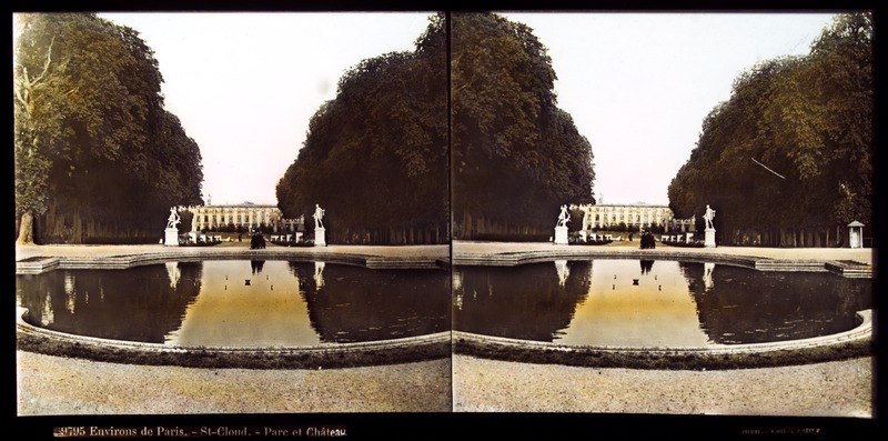 Saint Cloud - Castello, veduta del viale centrale del parco con il laghetto in primo piano e la facciata del palazzo in fondoFerrier père et fils et Soulier et LevyLe Lieure