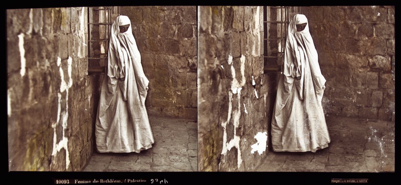 Betlemme - Una donna palestinese, posa a figura intera vicino a una finestra con inferriata Ferrier père et fils et Soulier et LevyLe Lieure
