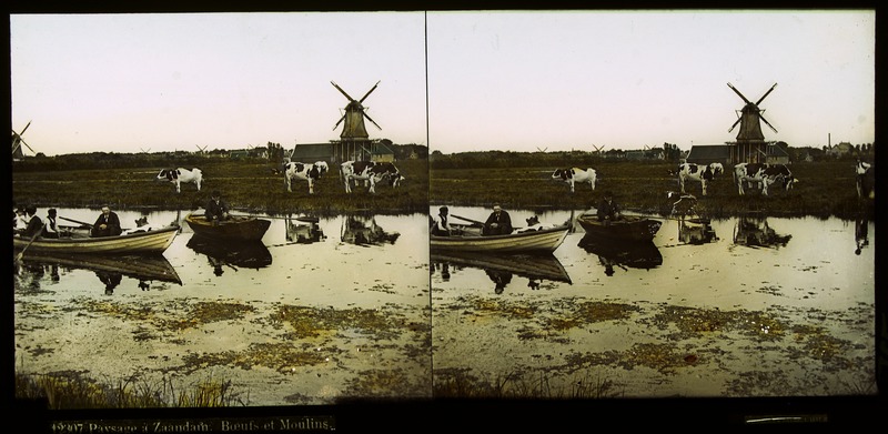 Zaandam - Veduta di una campagna con due barche a remi in un canale. Sullo sfondo i mulini a ventoFerrier père et fils et Soulier et LevyLe Lieure