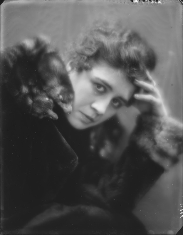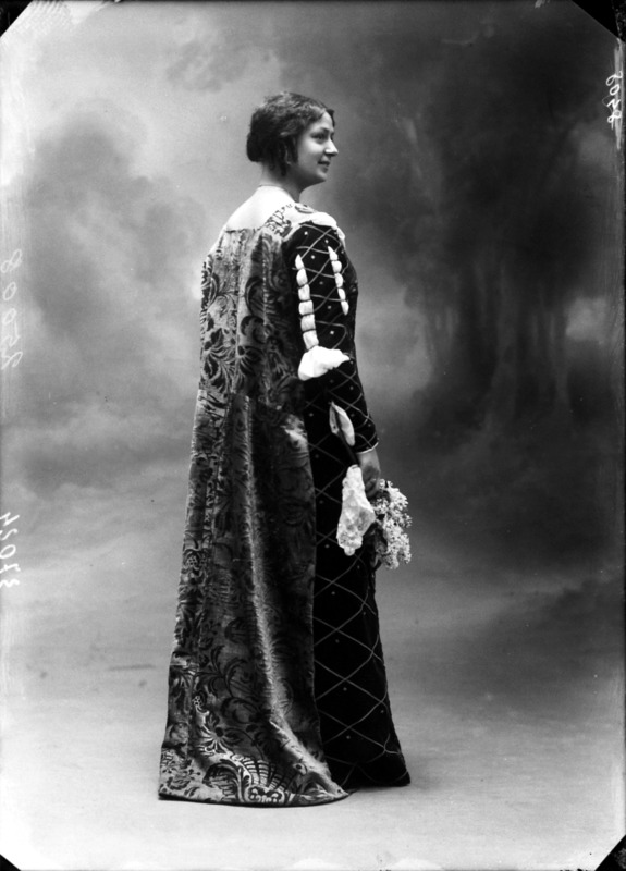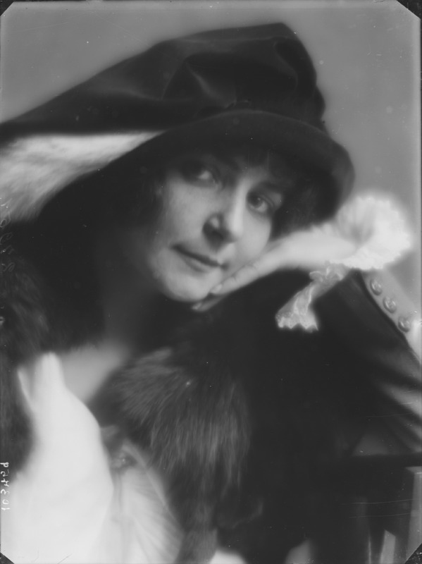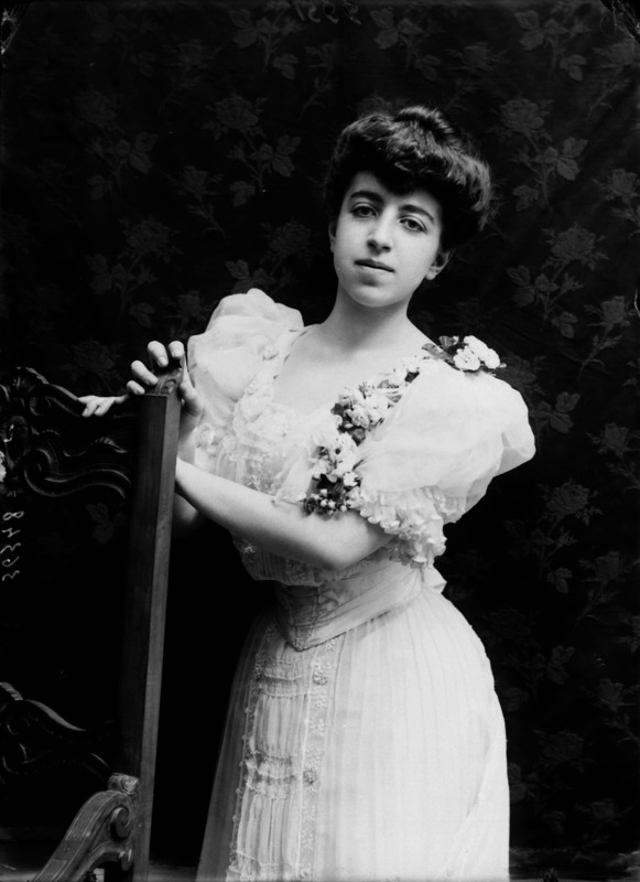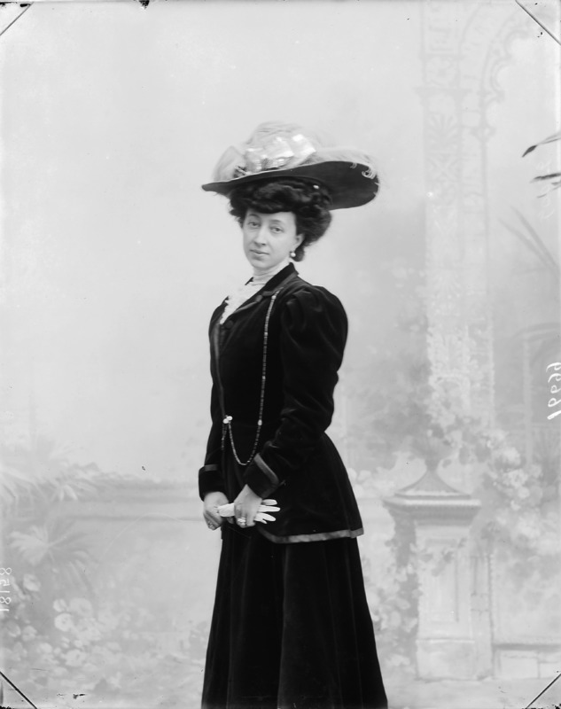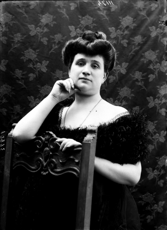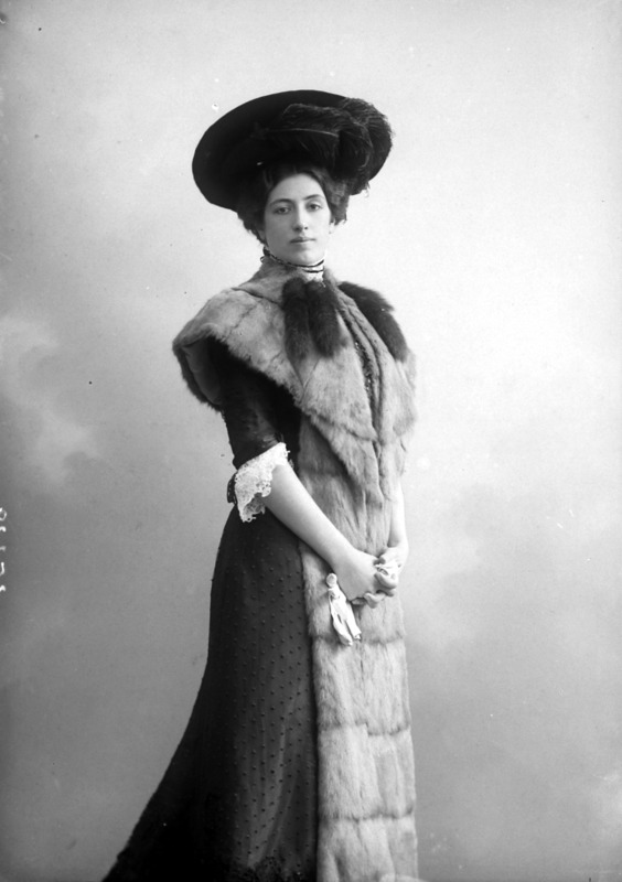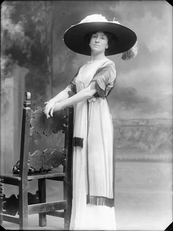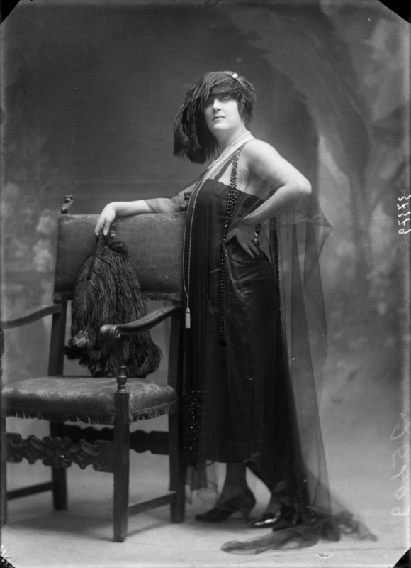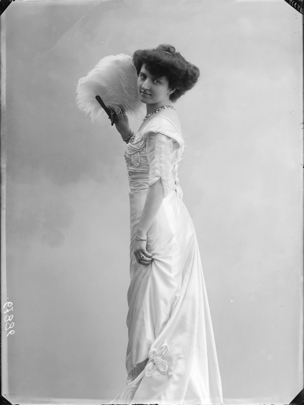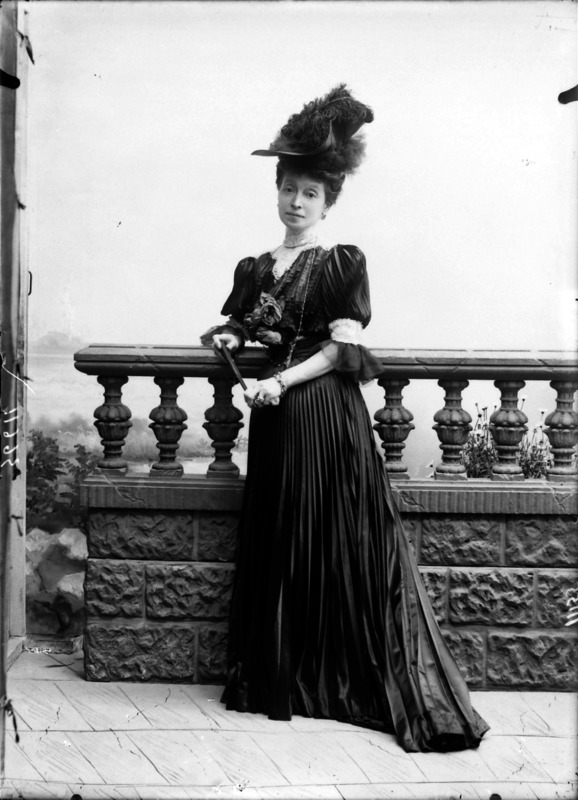 Paola, principessa di Ostheim, Sassonia, Weimar - Ritratti - 1910-1920 ca.. Ritratto, a figura intera, della principessa Paola di Ostheim, Sassonia, Weimar. Il soggetto, posto al centro dell'immagine, con il corpo di profilo ed il volto frontale, rivolge lo sguardo verso l'obbiettivo- porta la mano sinistra sul fianco e appoggia il braccio destro sullo schienale di una poltrona, mentre tiene con la stessa mano un ventaglio di piume di struzzo- indossa un abito da sera ed un cappello ornato di piume di struzzo. E' presente un fondale dipinto..