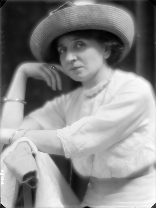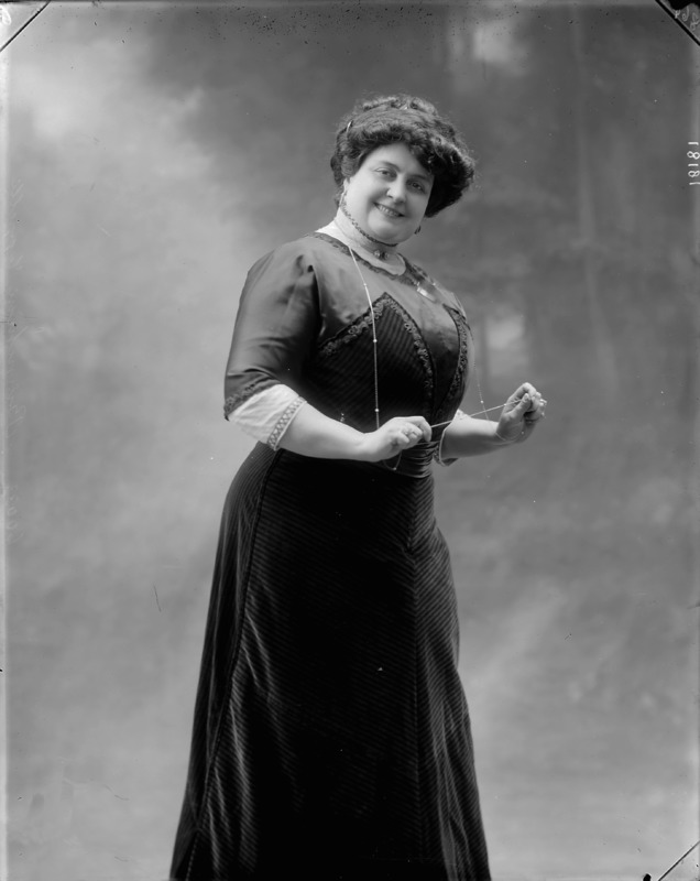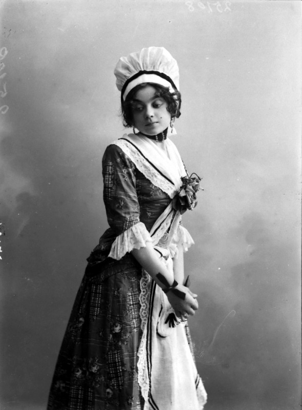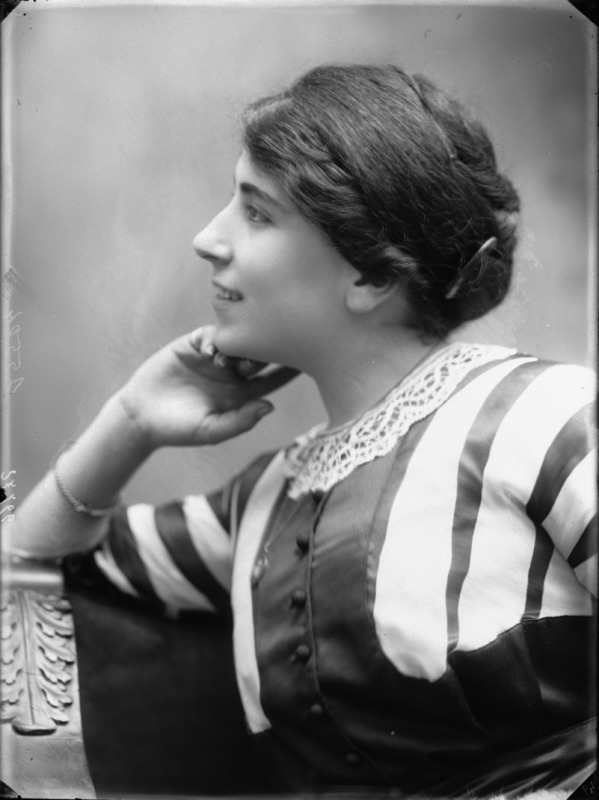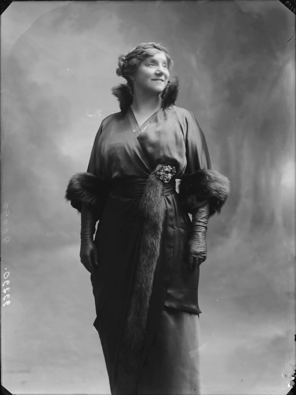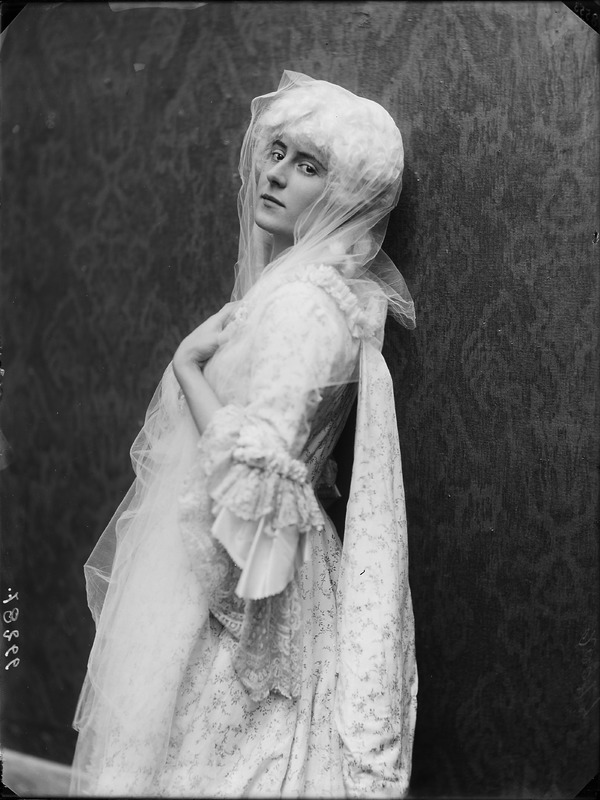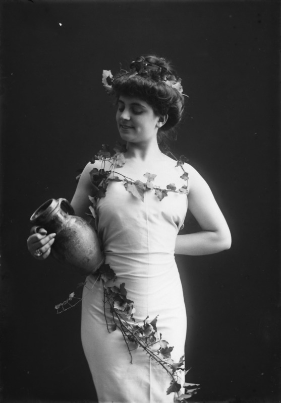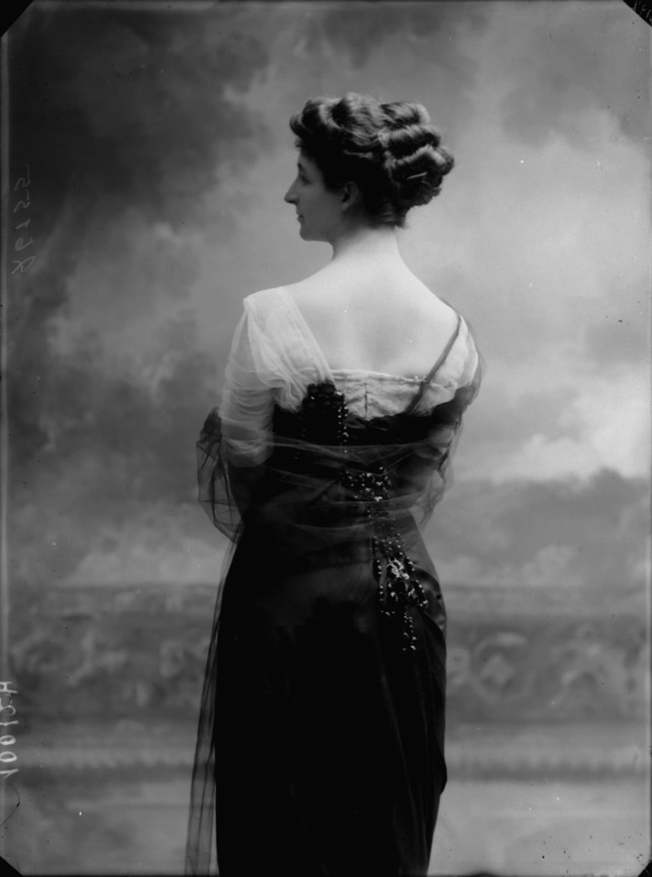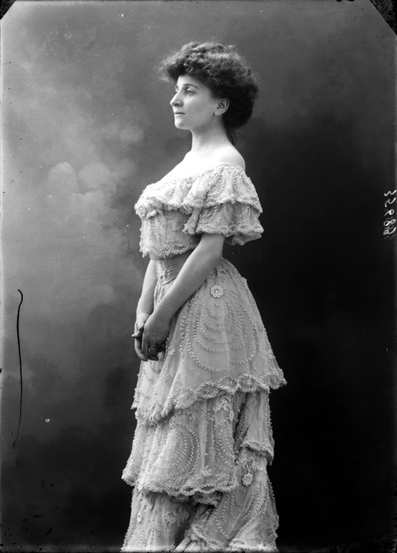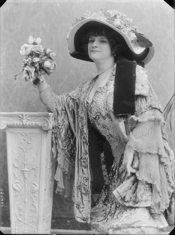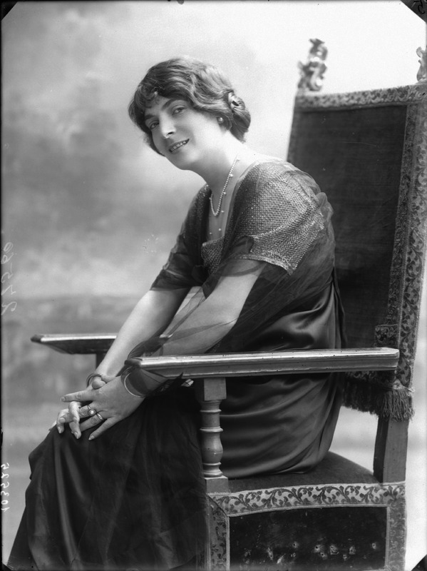 Paola, principessa di Ostheim, Sassonia, Weimar - Ritratti - 1910-1920 ca.. Ritratto, a figura intera, della principessa Paola di Ostheim, Sassonia, Weimar. Il soggetto, posto al centro dell'immagine, con il corpo di profilo ed il volto frontale, rivolge lo sguardo verso l'obbiettivo- porta la mano sinistra sul fianco e appoggia il braccio destro sullo schienale di una poltrona, mentre tiene con la stessa mano un ventaglio di piume di struzzo- indossa un abito da sera ed un cappello ornato di piume di struzzo. E' presente un fondale dipinto..
