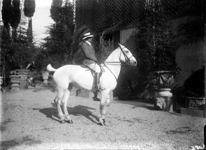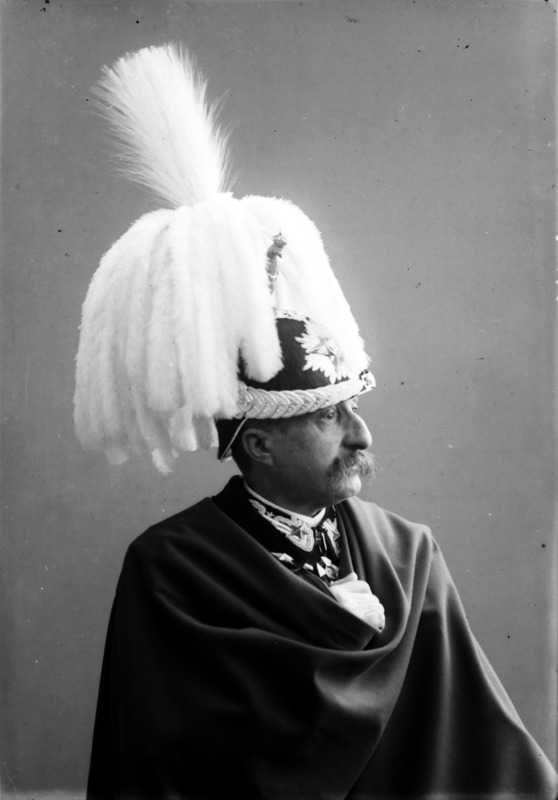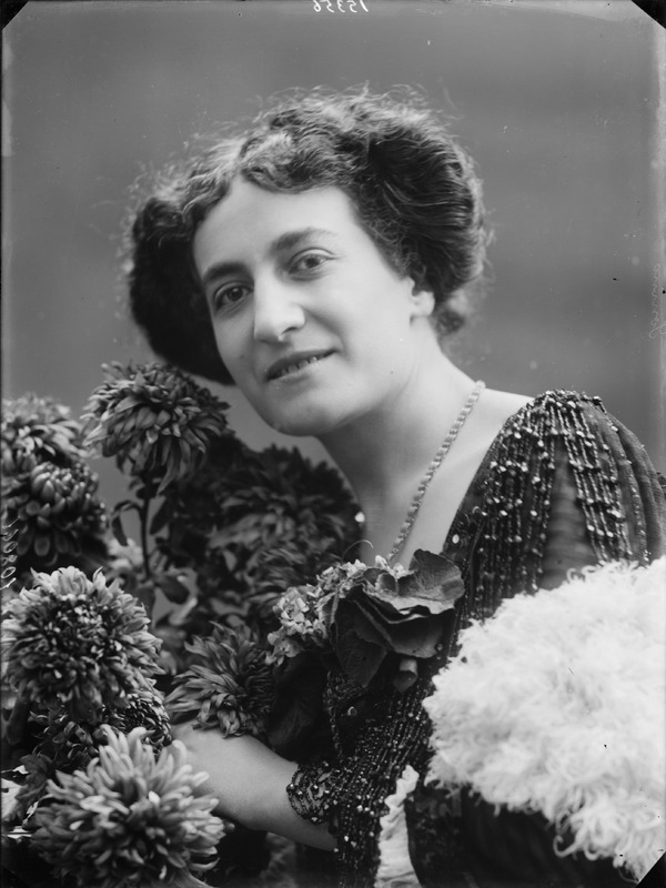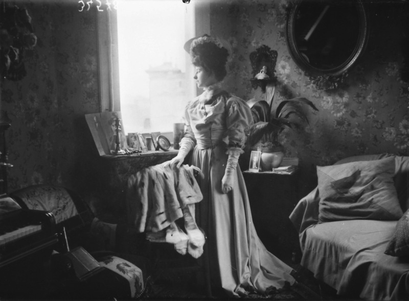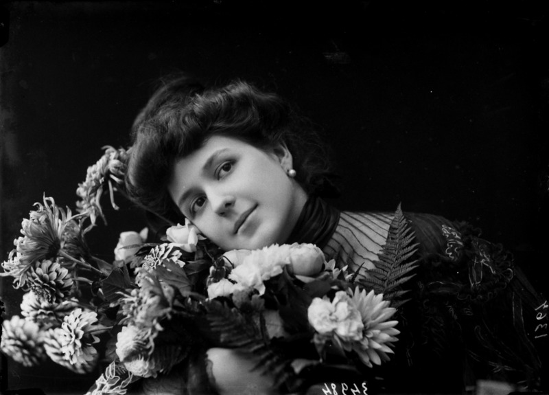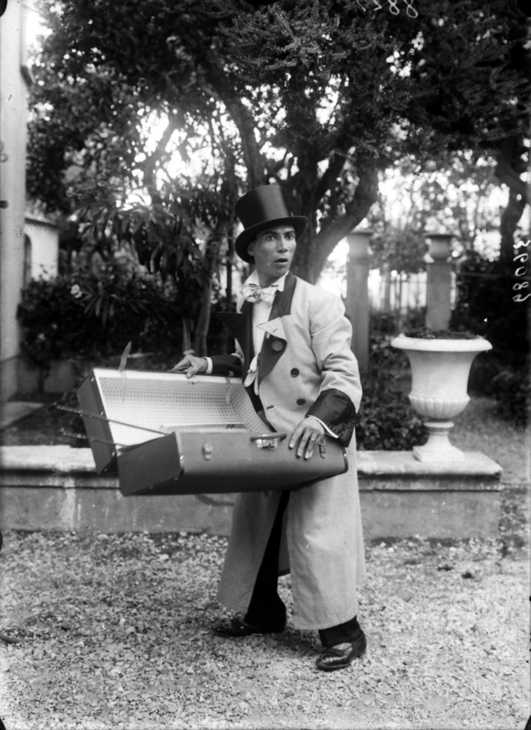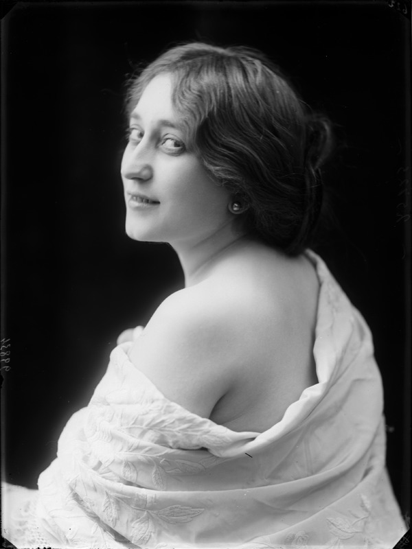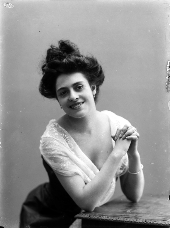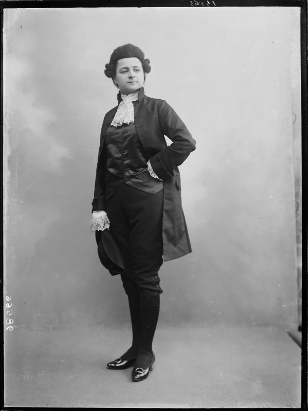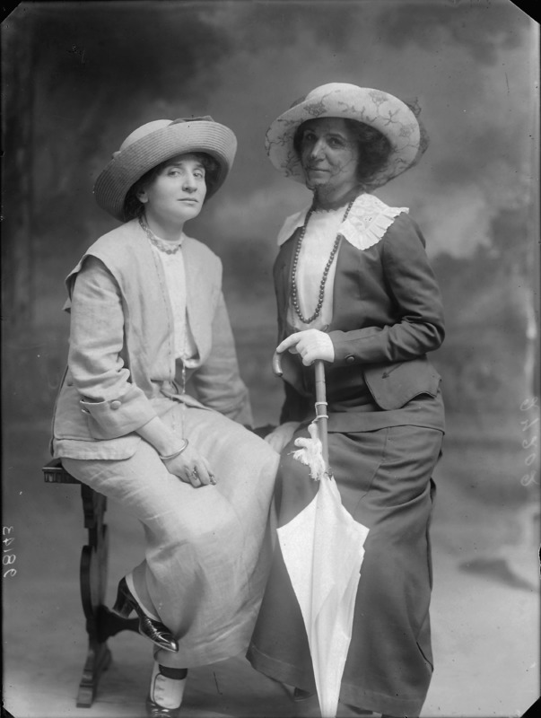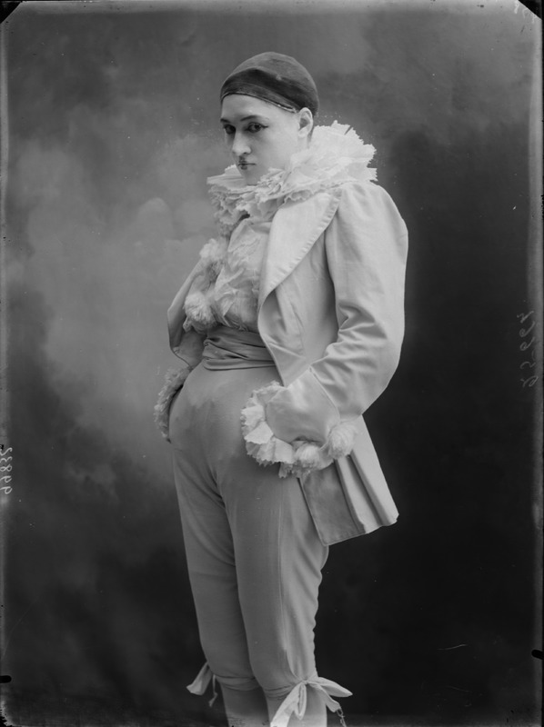 Paola, principessa di Ostheim, Sassonia, Weimar - Ritratti - 1910-1920 ca.. Ritratto, a figura intera, della principessa Paola di Ostheim, Sassonia, Weimar. Il soggetto, posto al centro dell'immagine, con il corpo di profilo ed il volto frontale, rivolge lo sguardo verso l'obbiettivo- porta la mano sinistra sul fianco e appoggia il braccio destro sullo schienale di una poltrona, mentre tiene con la stessa mano un ventaglio di piume di struzzo- indossa un abito da sera ed un cappello ornato di piume di struzzo. E' presente un fondale dipinto..