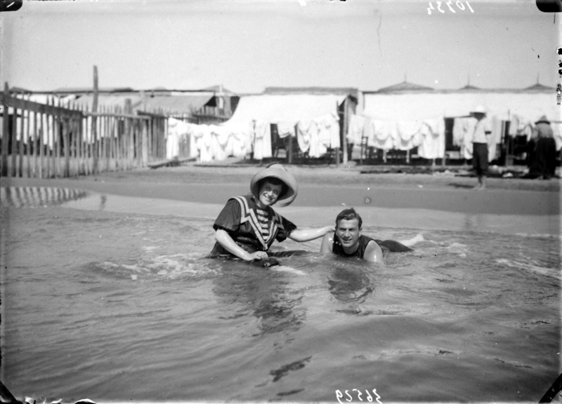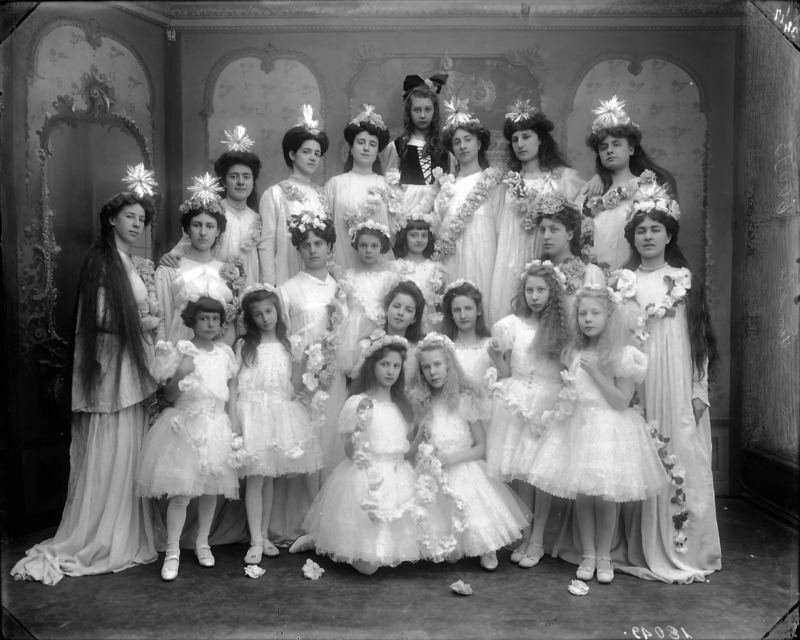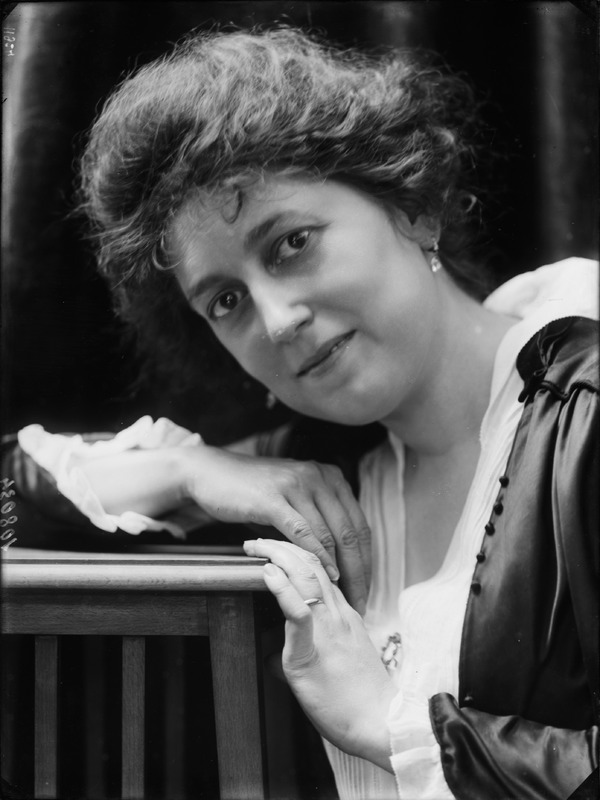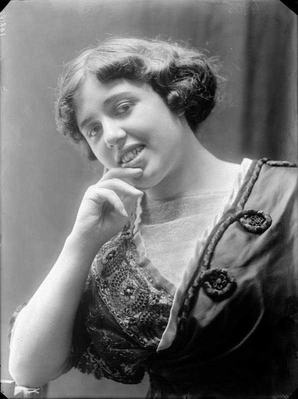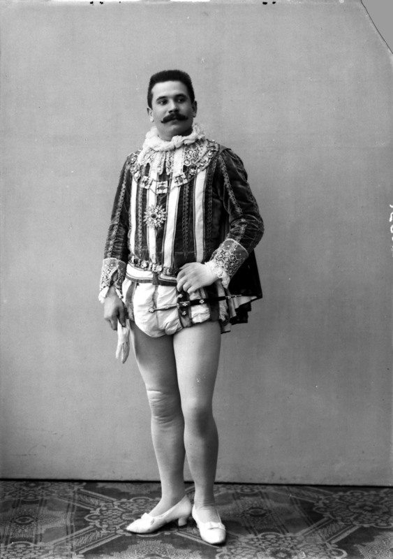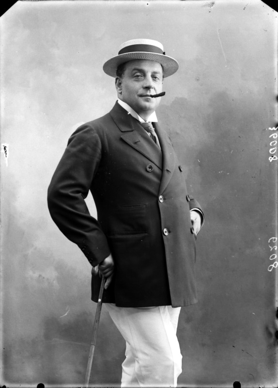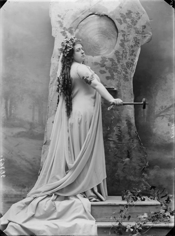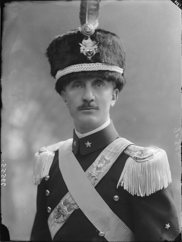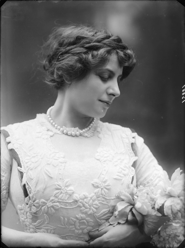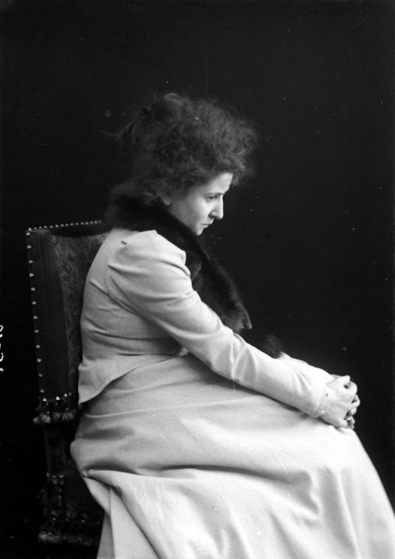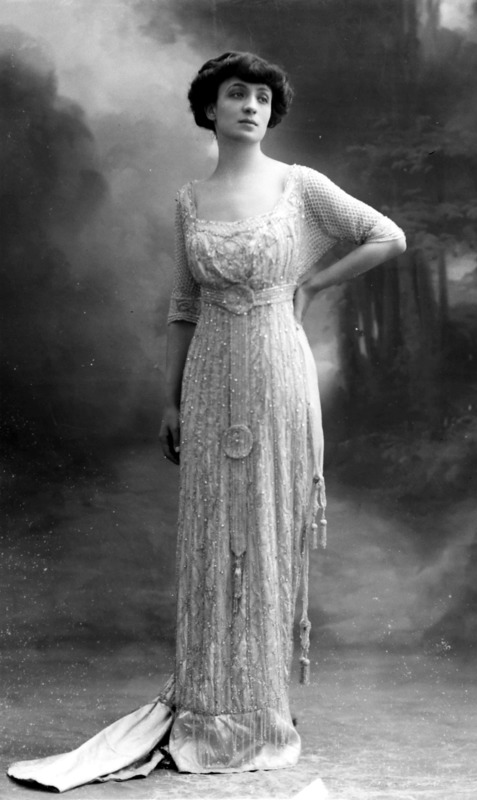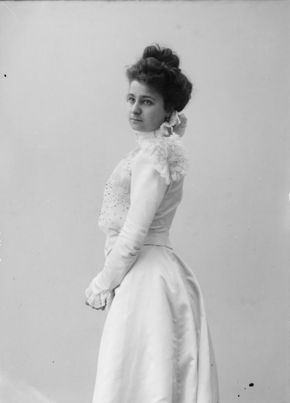 Paola, principessa di Ostheim, Sassonia, Weimar - Ritratti - 1910-1920 ca.. Ritratto, a figura intera, della principessa Paola di Ostheim, Sassonia, Weimar. Il soggetto, posto al centro dell'immagine, con il corpo di profilo ed il volto frontale, rivolge lo sguardo verso l'obbiettivo- porta la mano sinistra sul fianco e appoggia il braccio destro sullo schienale di una poltrona, mentre tiene con la stessa mano un ventaglio di piume di struzzo- indossa un abito da sera ed un cappello ornato di piume di struzzo. E' presente un fondale dipinto..