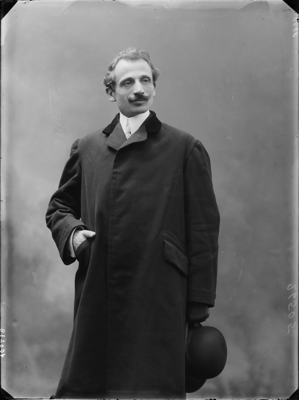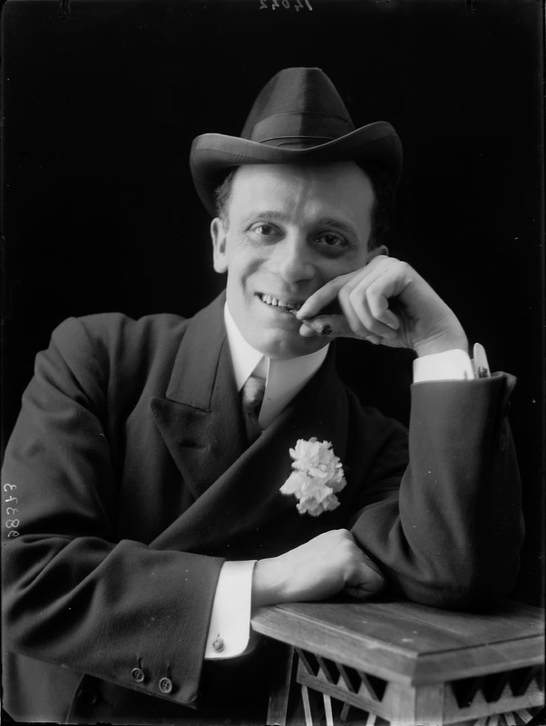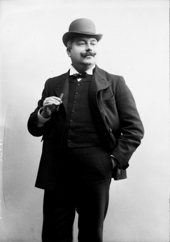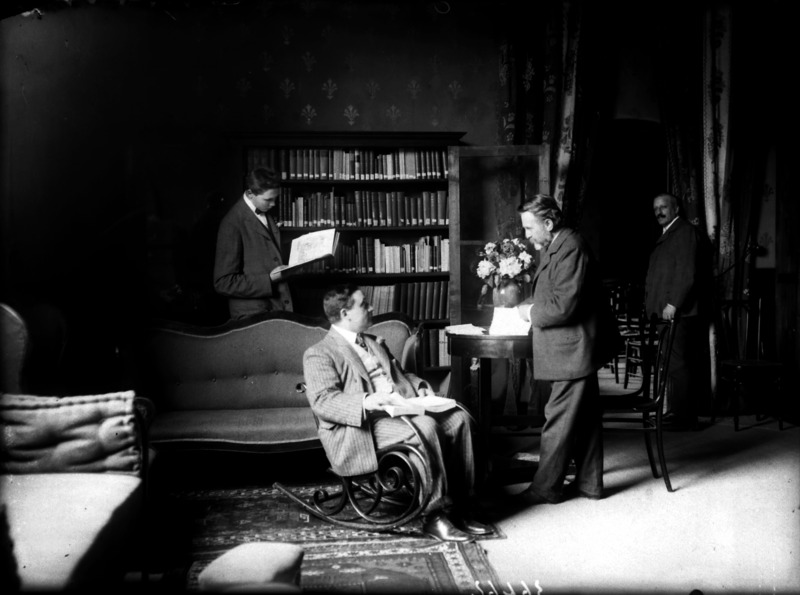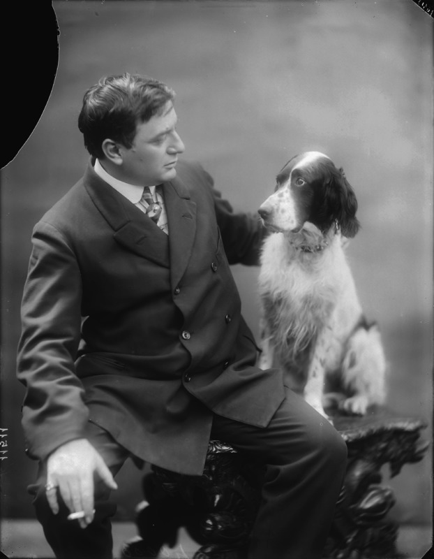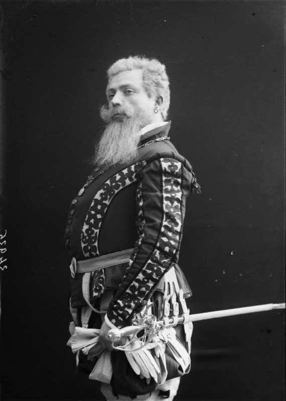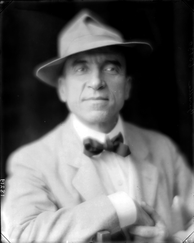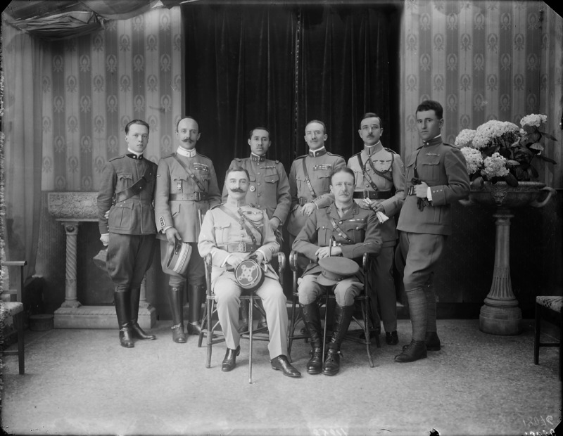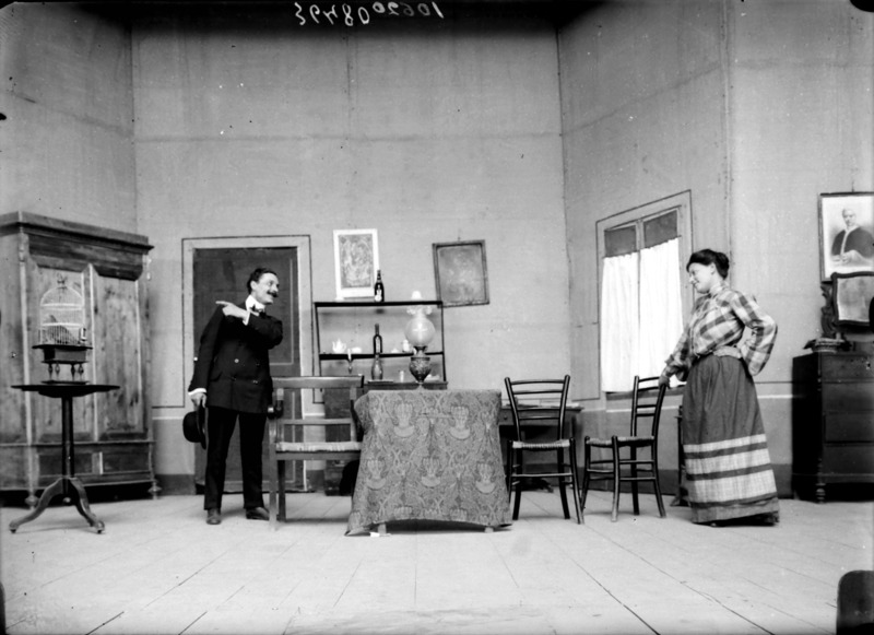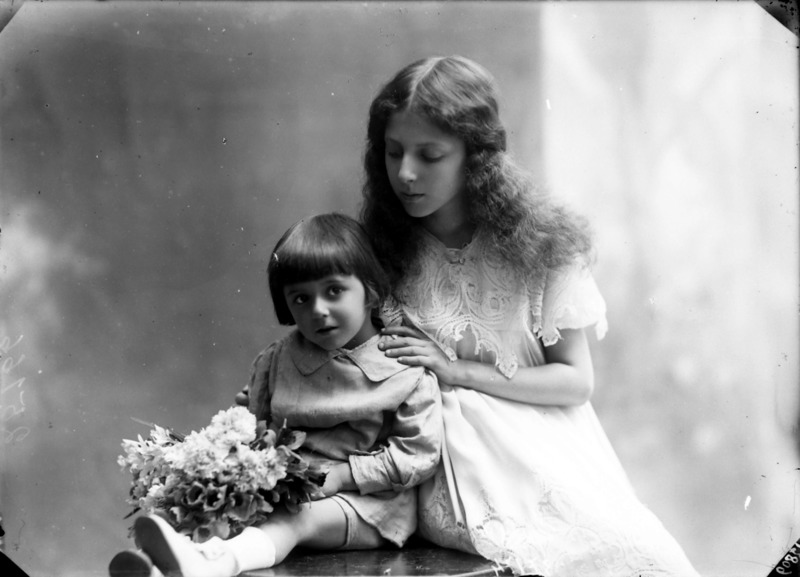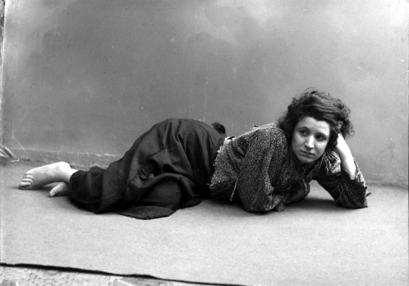 Paola, principessa di Ostheim, Sassonia, Weimar - Ritratti - 1910-1920 ca.. Ritratto, a figura intera, della principessa Paola di Ostheim, Sassonia, Weimar. Il soggetto, posto al centro dell'immagine, con il corpo di profilo ed il volto frontale, rivolge lo sguardo verso l'obbiettivo- porta la mano sinistra sul fianco e appoggia il braccio destro sullo schienale di una poltrona, mentre tiene con la stessa mano un ventaglio di piume di struzzo- indossa un abito da sera ed un cappello ornato di piume di struzzo. E' presente un fondale dipinto..