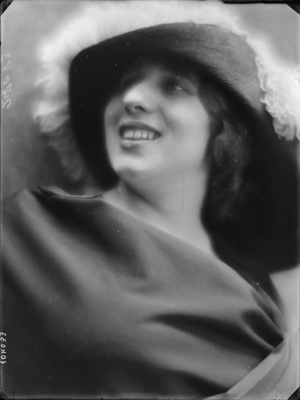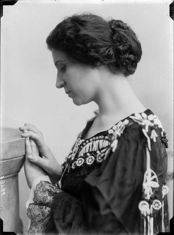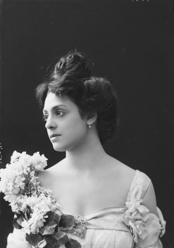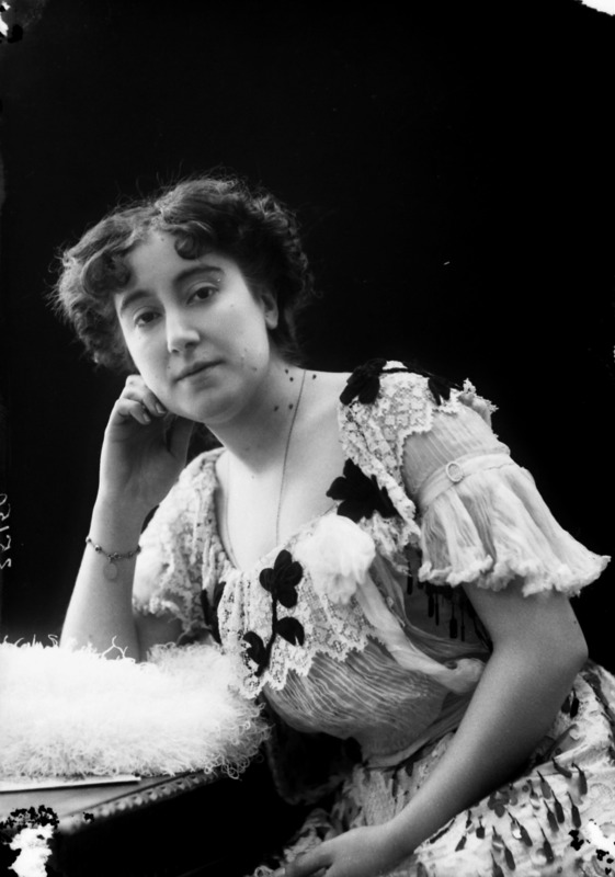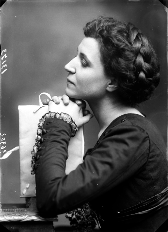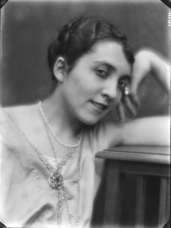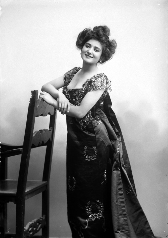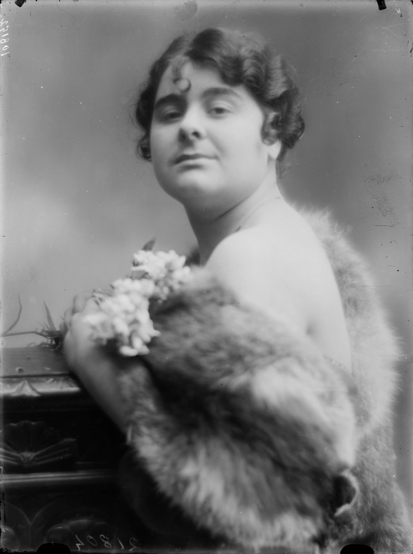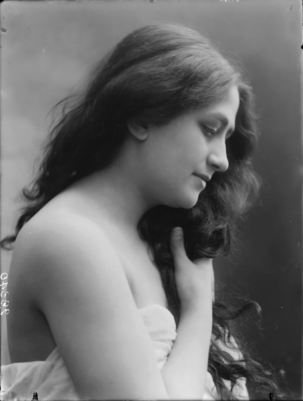 Della Rizza, Gilda- Cantanti - Ritratti fotografici- Donne - Ritratti fotografici. Ritratto, a mezzo busto, di Gilda Della Rizza. Il soggetto, leggermente spostato a sinistra dell'immagine con il corpo di spalle ed il volto di profilo, indossa un abito con un'ampia scollatura, che lascia scoperte le spalle, ed ha i capelli raccolti dietro la nuca. Si osserva, sullo sfondo, un tendaggio..