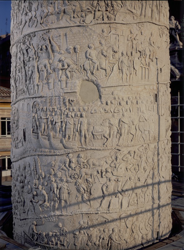 Roma - Foro Traiano - Colonna coclide Traiana - Particolare lato sud: i Romani avanzano in una foresta tra fortificazioni nemiche, l'esercito passail Danubio, partenza dell'esercito - Marmo lunense - Sec. II d.C.Fotografo GFNGabinetto Fotografico Nazionale