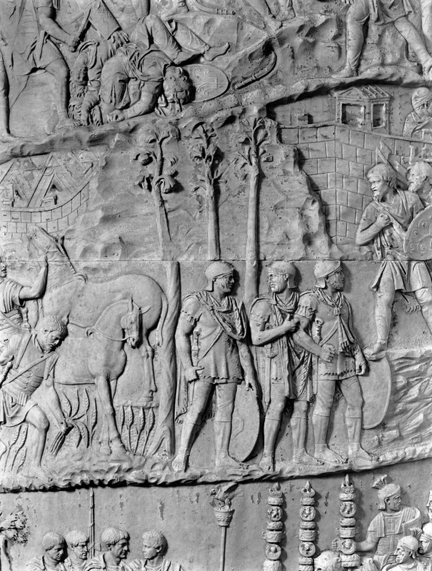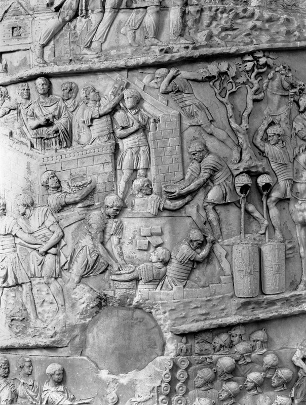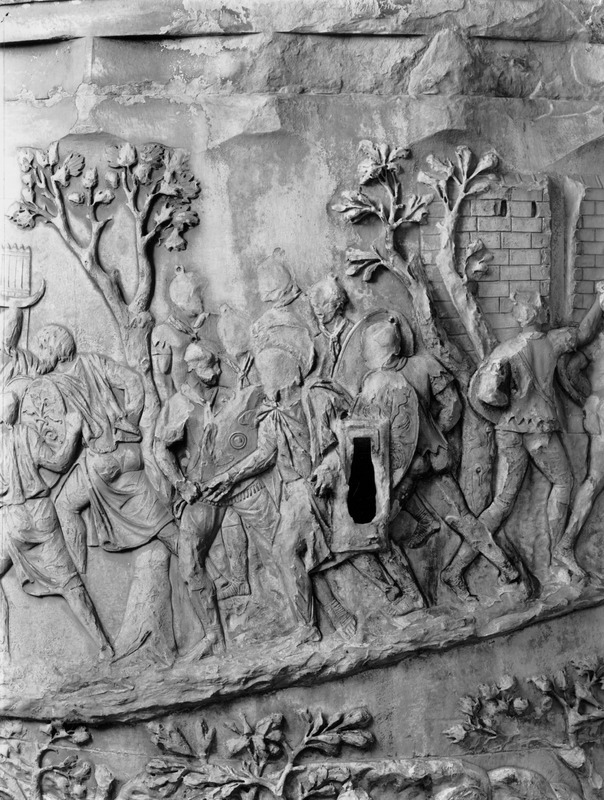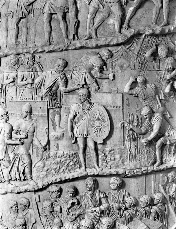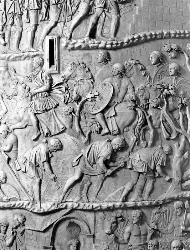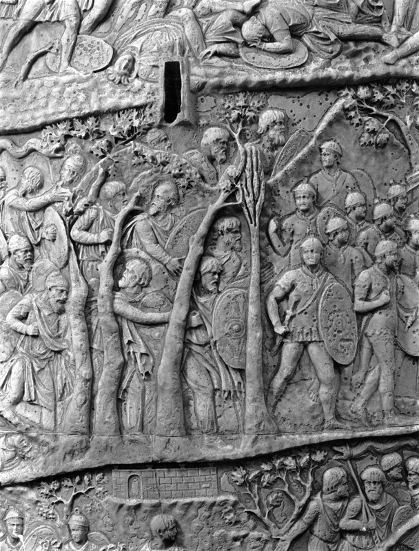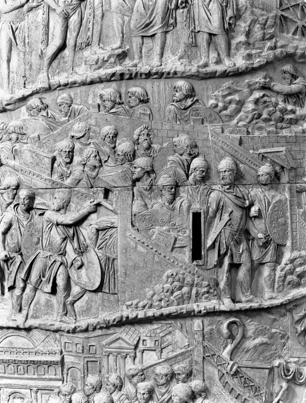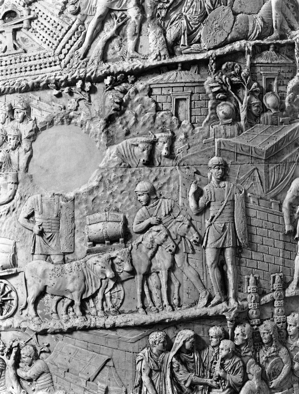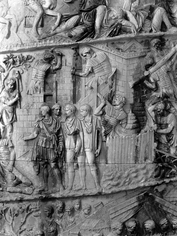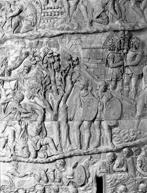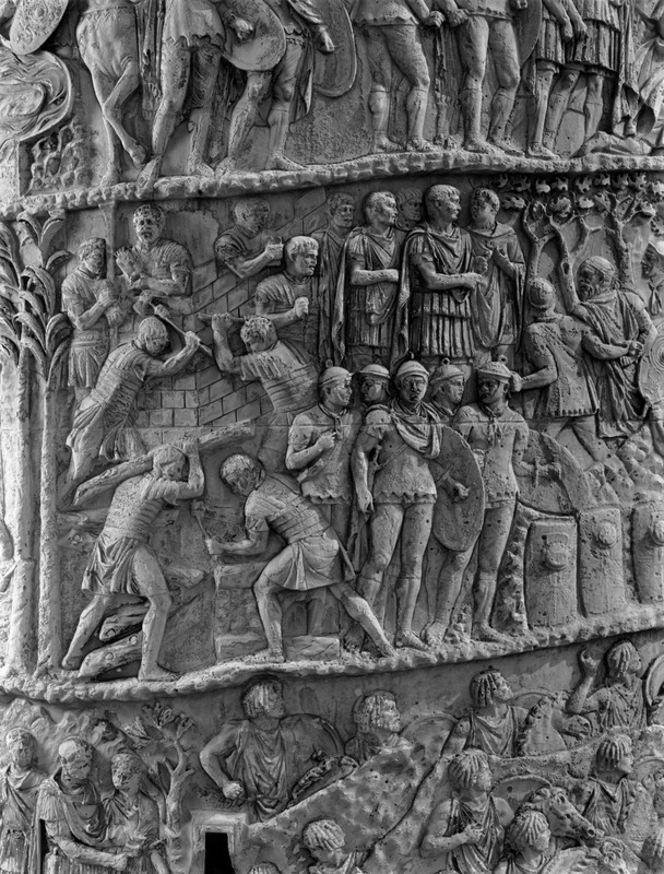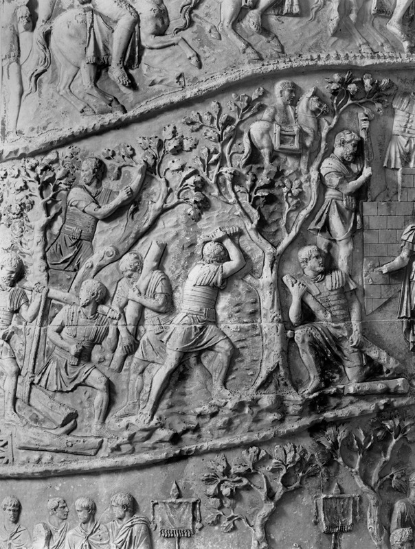 Roma - Foro Traiano, Colonna Traiana, a sinistra, legionari romani mentre mietono il grano e lo caricano su dei muli. Al centro, ausiliari romani mandati in avanscoperta, osservano, nascosti tra gli alberi di una foresta, le mura di una città dace, identificata con la capitale Sarmizegetusa Regia. Al suo interno (a destra) si scorgono alcuni daci pileati in grande agitazione a causa dell'avanzata romana. All'esterno delle mura, alcuni guerrieri daci osservano il terreno e discutono su dove porre le fortificazioni a protezione della loro capitale (tavole LXXXI-LXXXII)