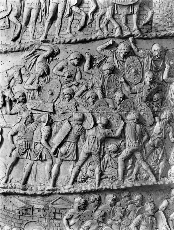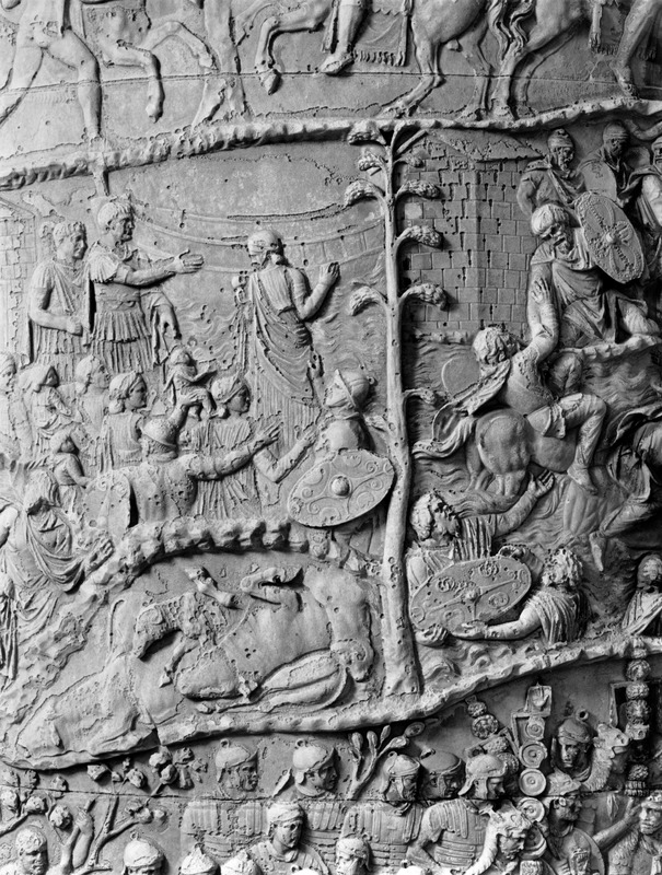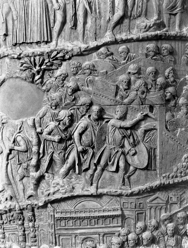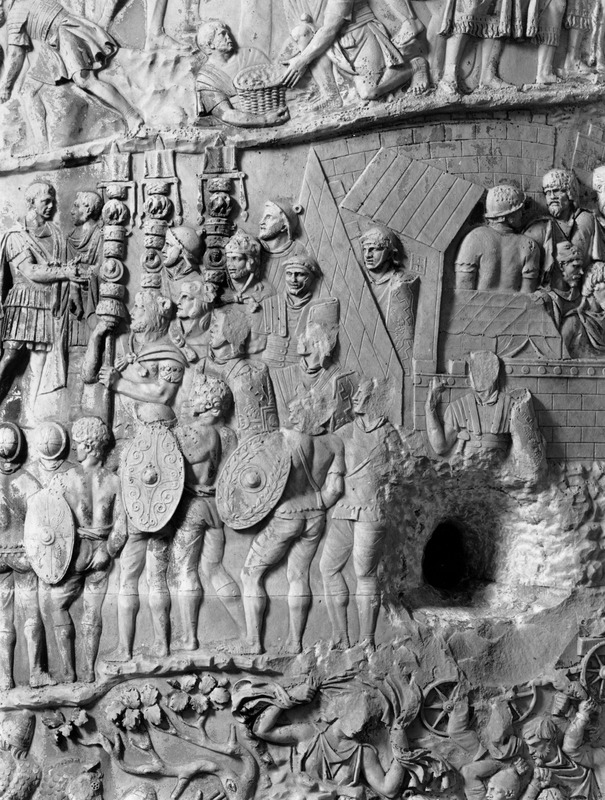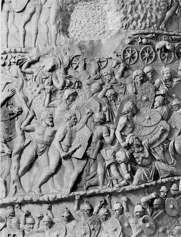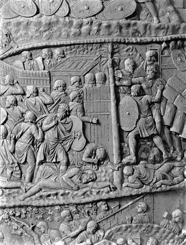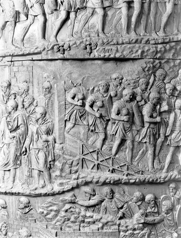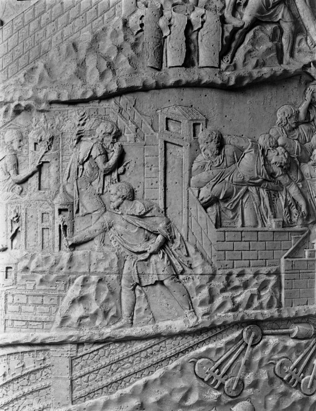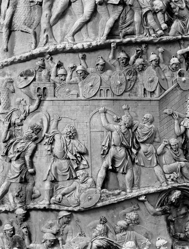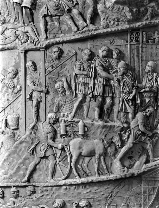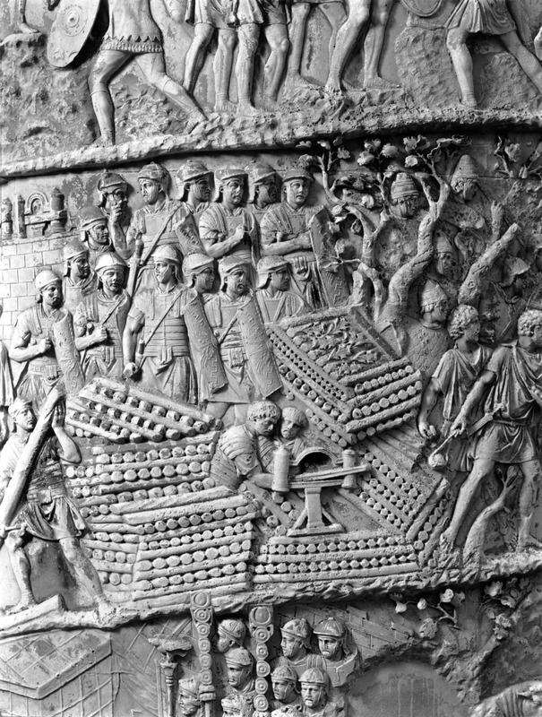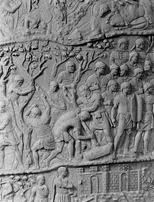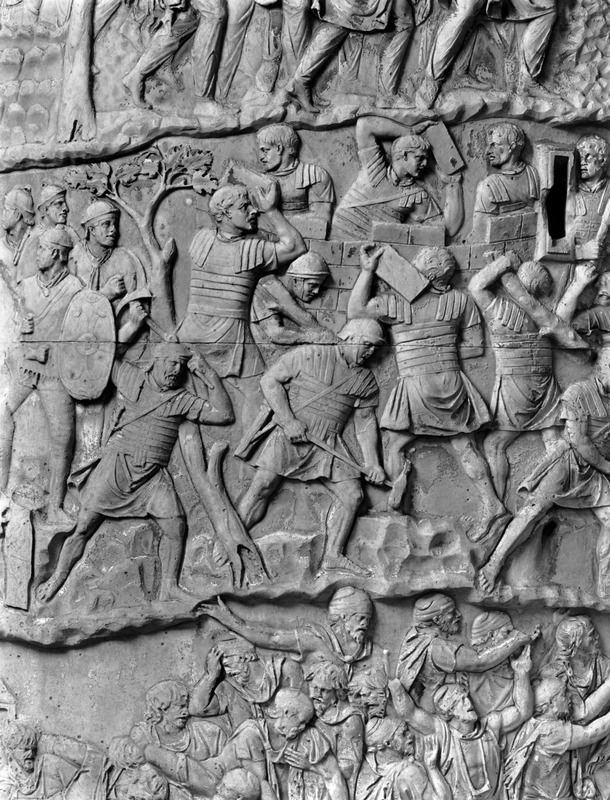 Roma - Foro Traiano, Colonna Traiana, a sinistra, legionari romani mentre mietono il grano e lo caricano su dei muli. Al centro, ausiliari romani mandati in avanscoperta, osservano, nascosti tra gli alberi di una foresta, le mura di una città dace, identificata con la capitale Sarmizegetusa Regia. Al suo interno (a destra) si scorgono alcuni daci pileati in grande agitazione a causa dell'avanzata romana. All'esterno delle mura, alcuni guerrieri daci osservano il terreno e discutono su dove porre le fortificazioni a protezione della loro capitale (tavole LXXXI-LXXXII)