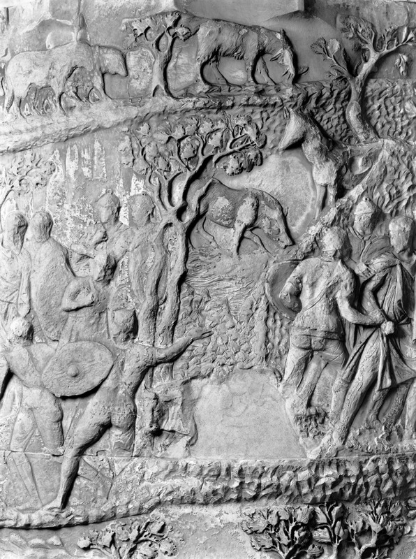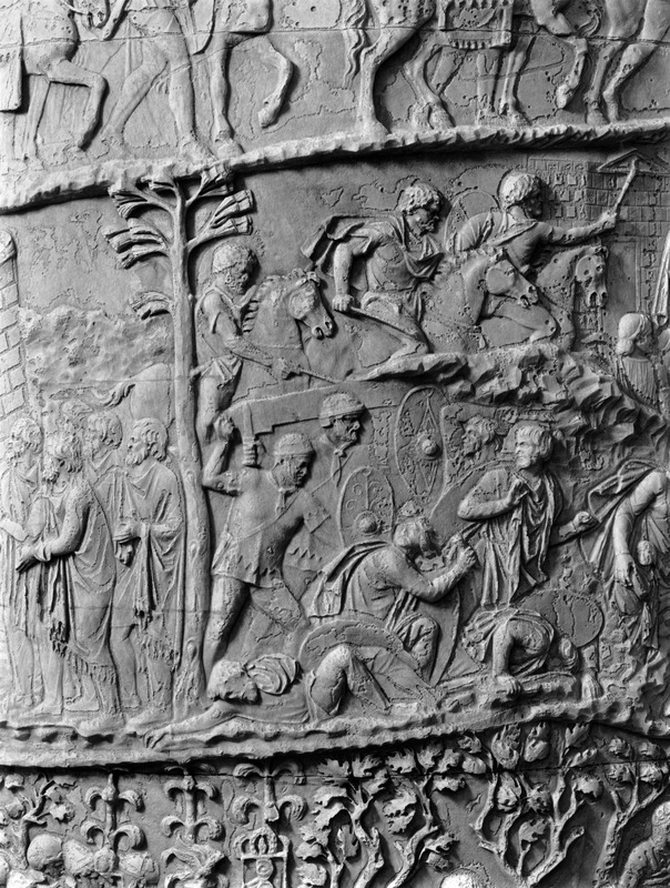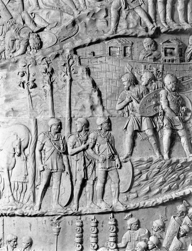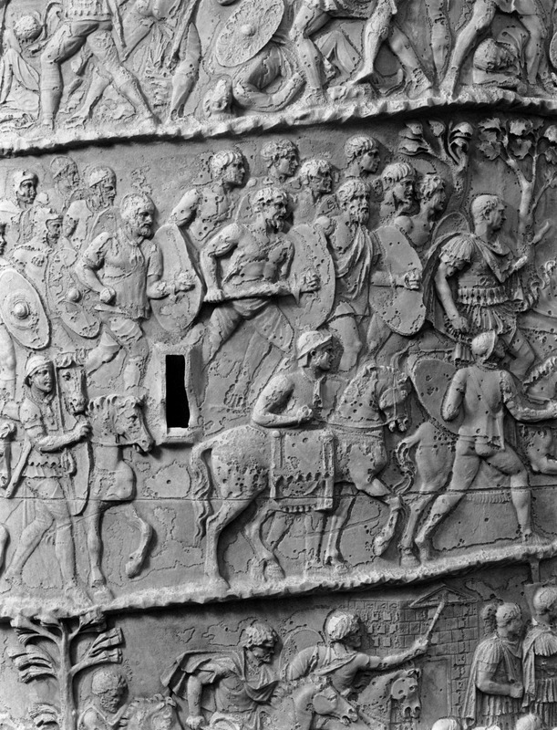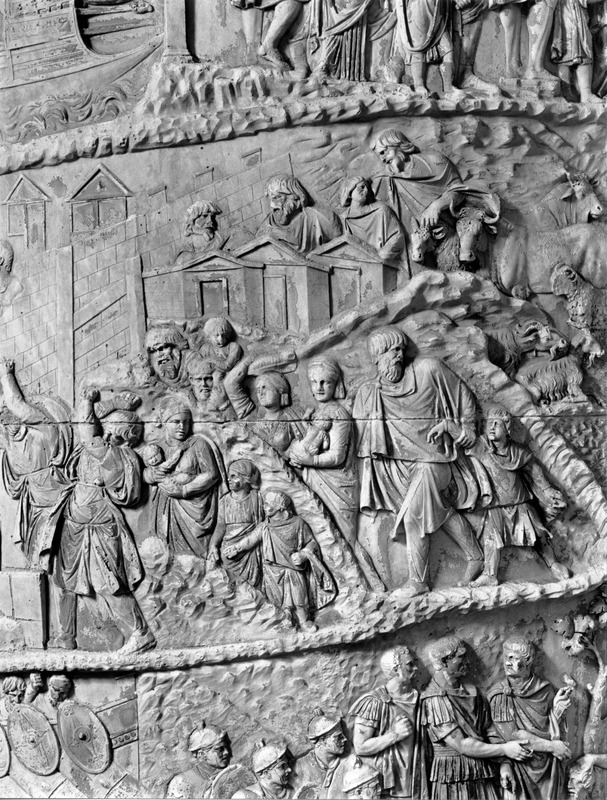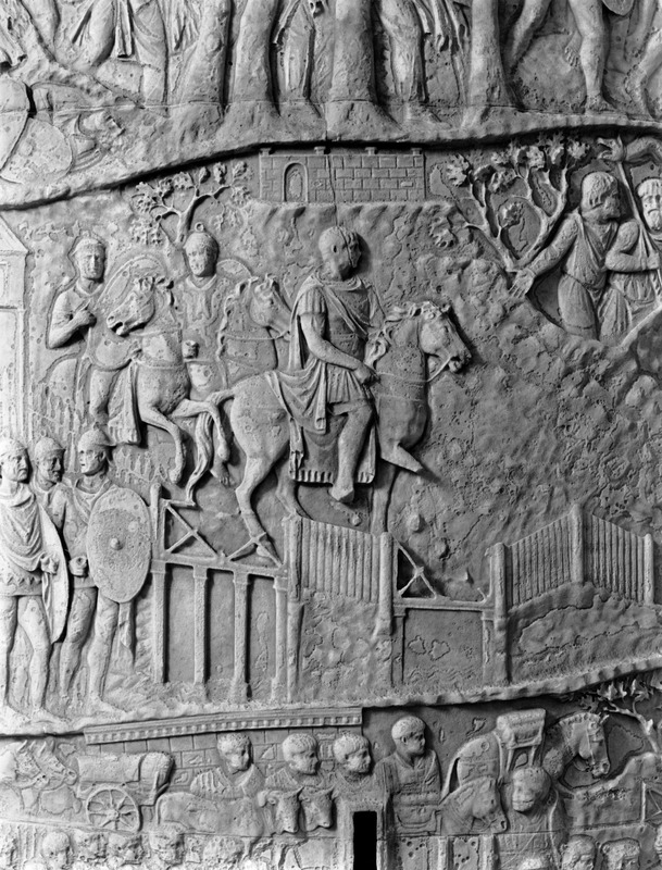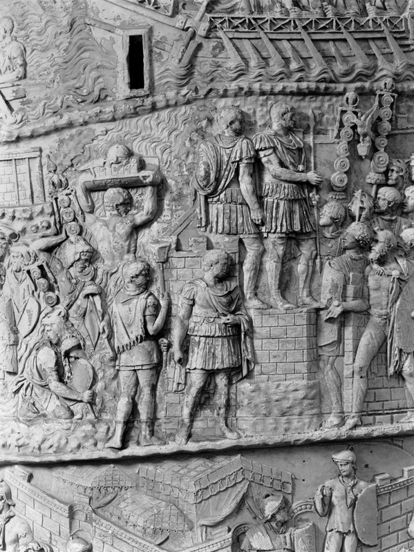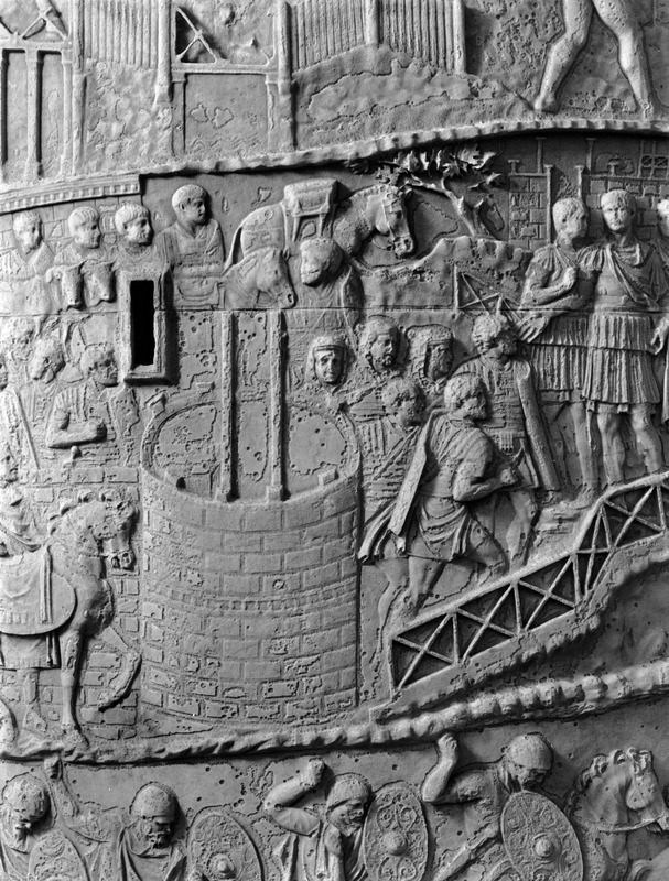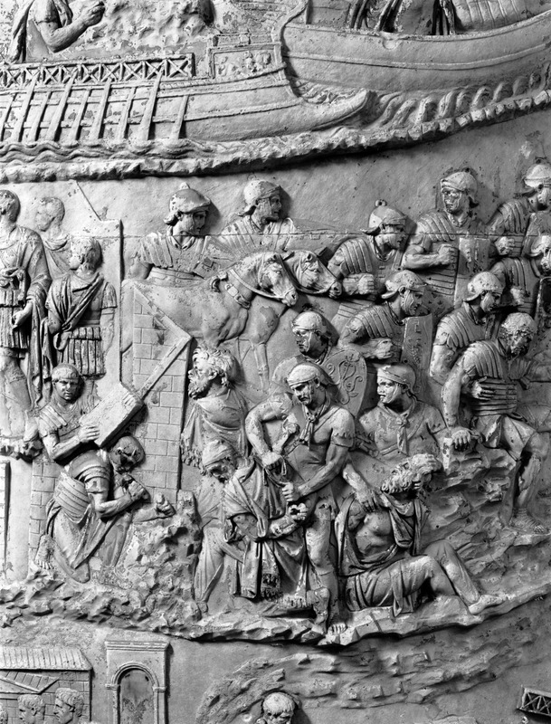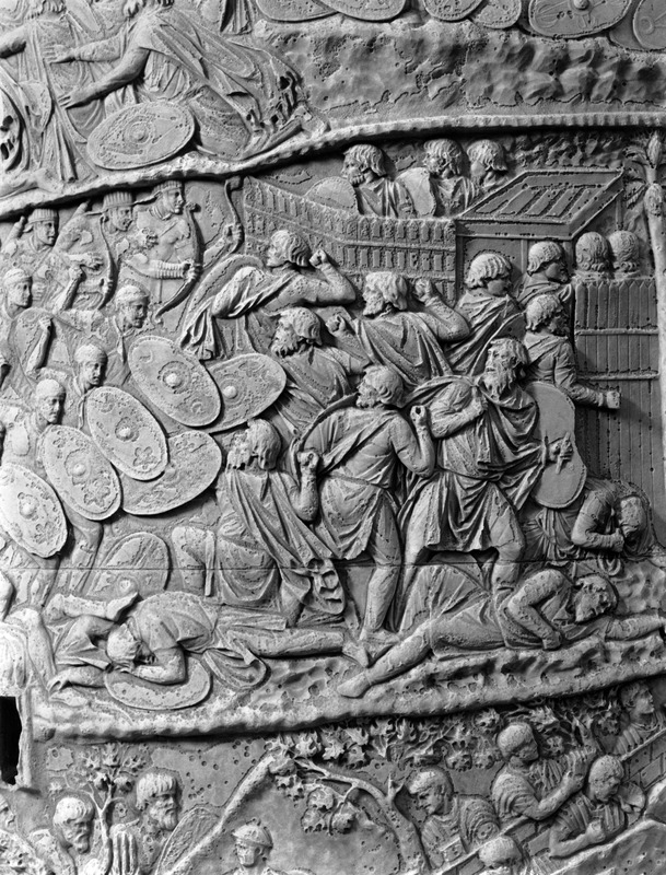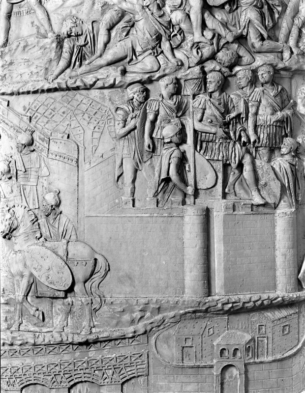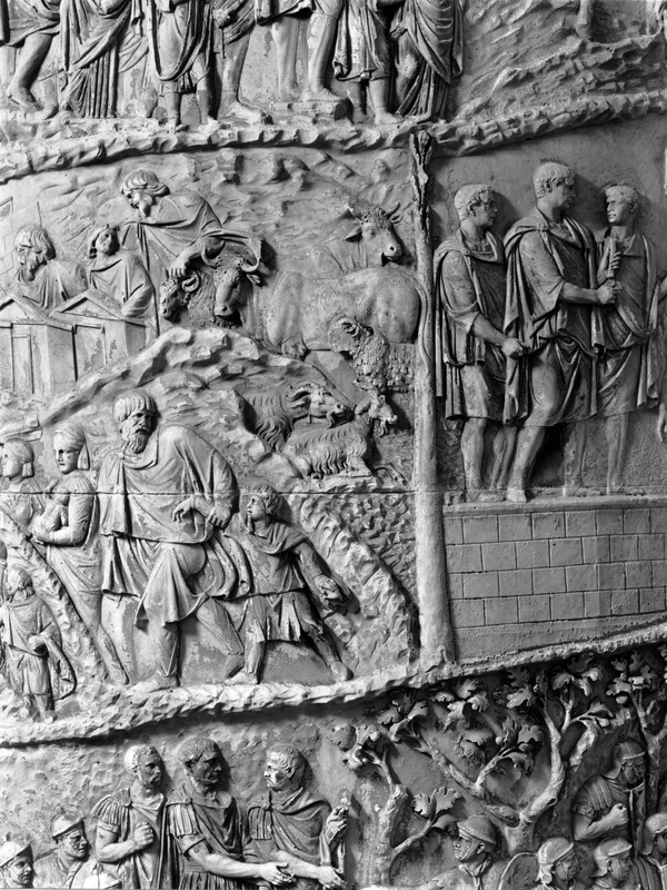 Roma - Foro Traiano, Colonna Traiana, a sinistra, legionari romani mentre mietono il grano e lo caricano su dei muli. Al centro, ausiliari romani mandati in avanscoperta, osservano, nascosti tra gli alberi di una foresta, le mura di una città dace, identificata con la capitale Sarmizegetusa Regia. Al suo interno (a destra) si scorgono alcuni daci pileati in grande agitazione a causa dell'avanzata romana. All'esterno delle mura, alcuni guerrieri daci osservano il terreno e discutono su dove porre le fortificazioni a protezione della loro capitale (tavole LXXXI-LXXXII)