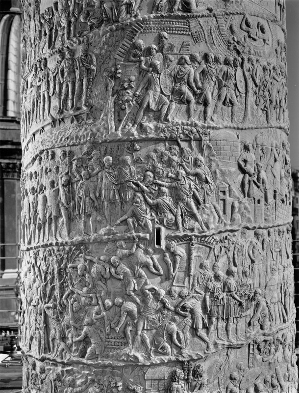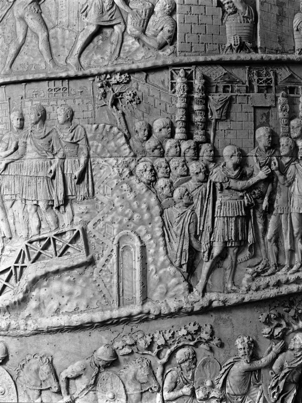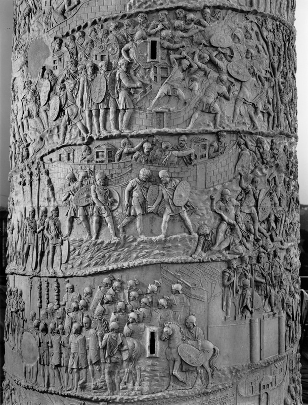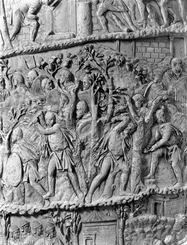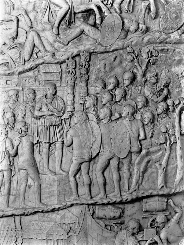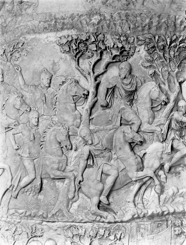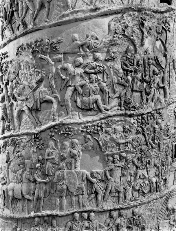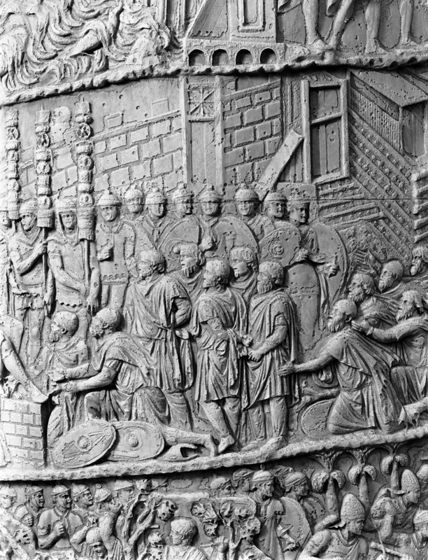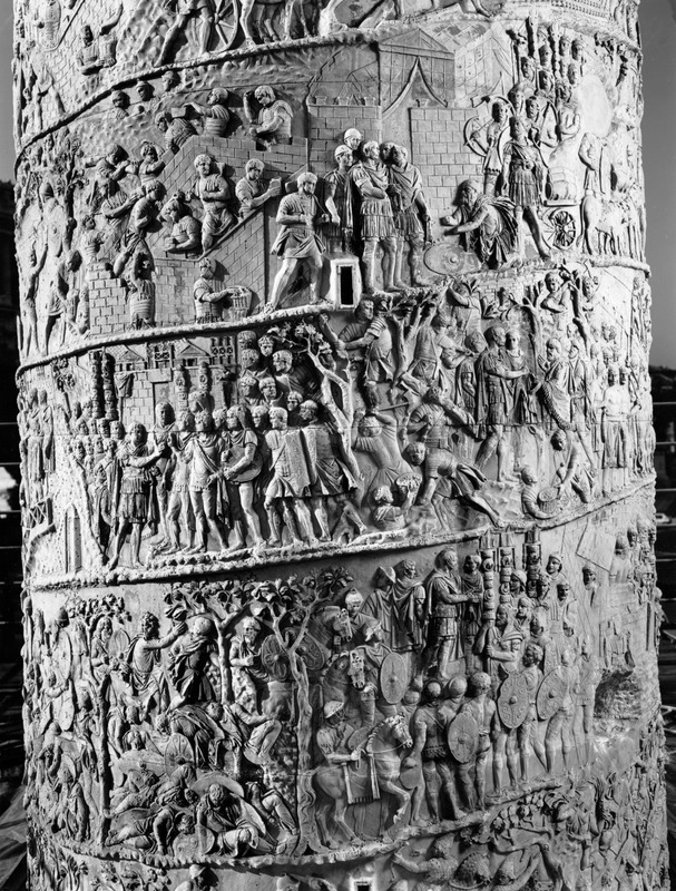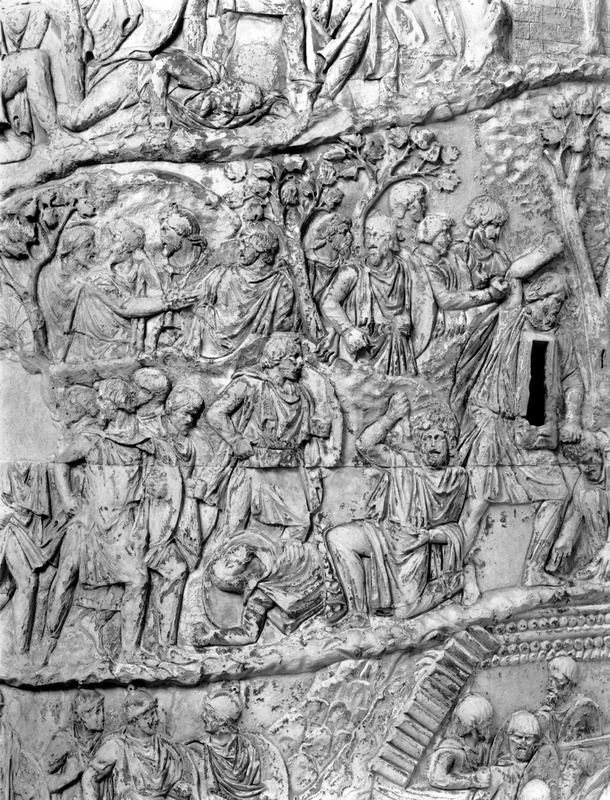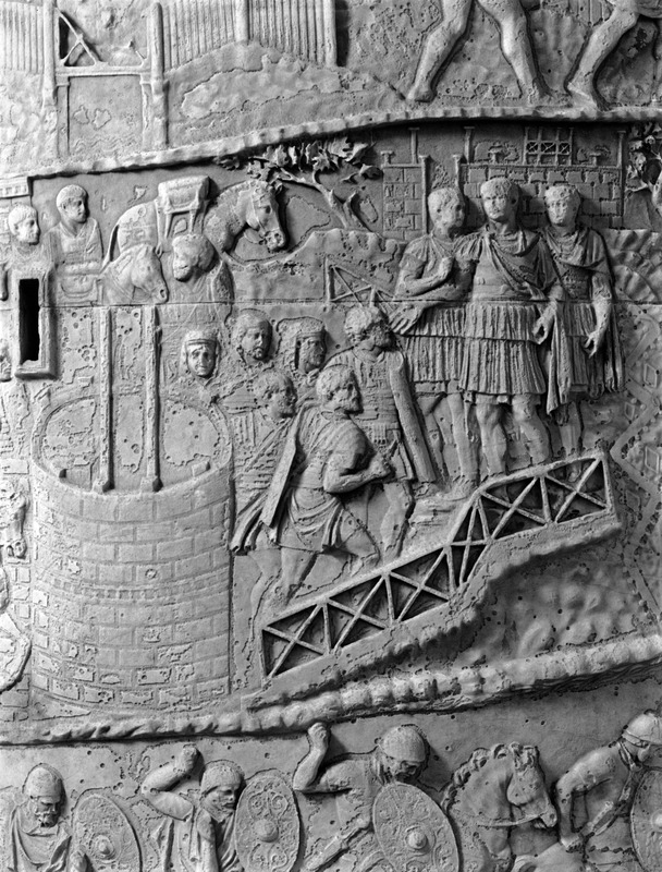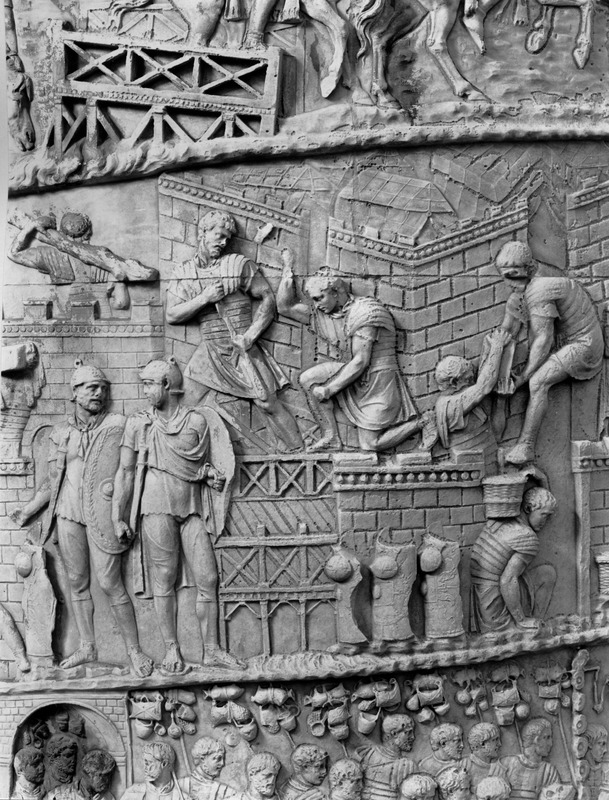 Roma - Foro Traiano, Colonna Traiana, a sinistra, legionari romani mentre mietono il grano e lo caricano su dei muli. Al centro, ausiliari romani mandati in avanscoperta, osservano, nascosti tra gli alberi di una foresta, le mura di una città dace, identificata con la capitale Sarmizegetusa Regia. Al suo interno (a destra) si scorgono alcuni daci pileati in grande agitazione a causa dell'avanzata romana. All'esterno delle mura, alcuni guerrieri daci osservano il terreno e discutono su dove porre le fortificazioni a protezione della loro capitale (tavole LXXXI-LXXXII)
