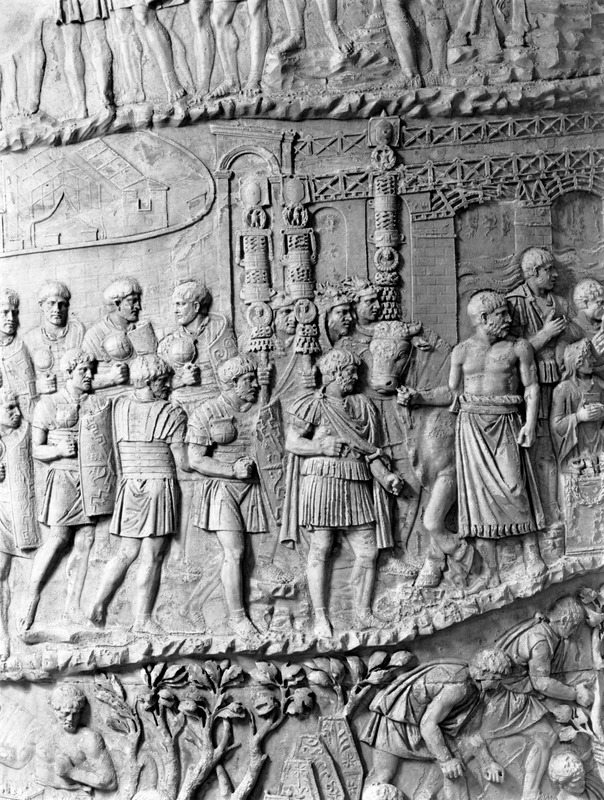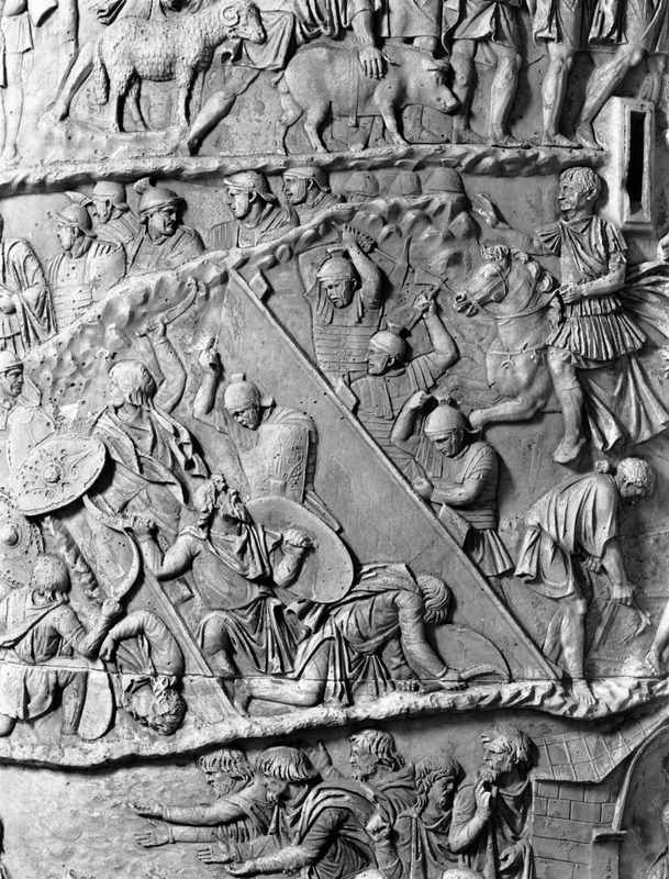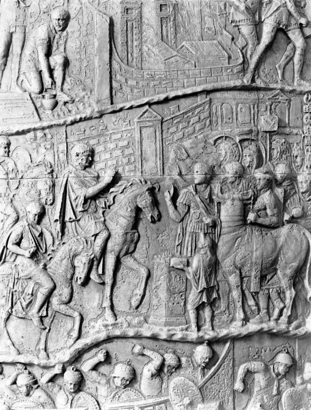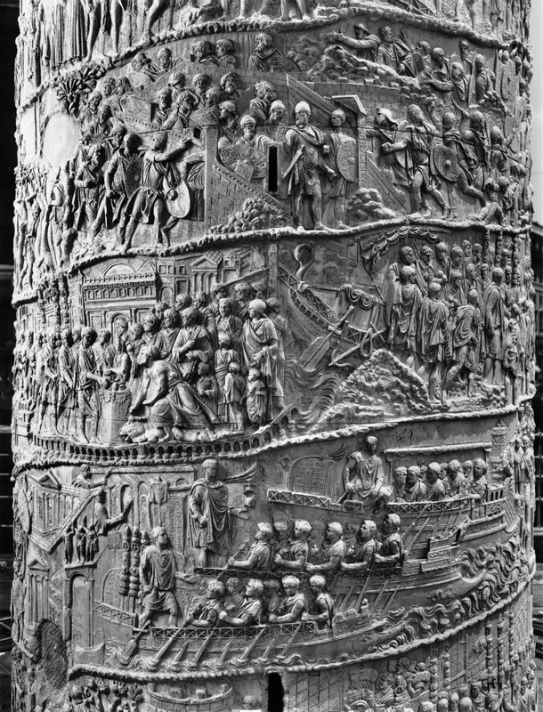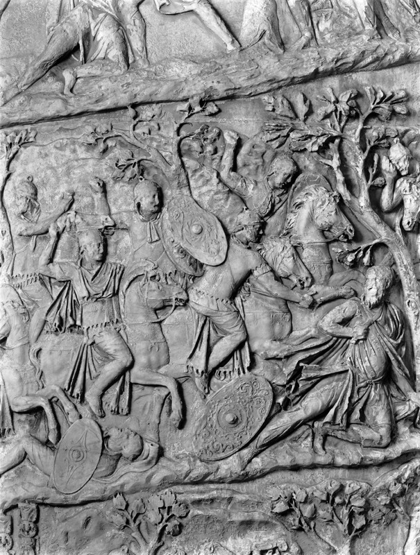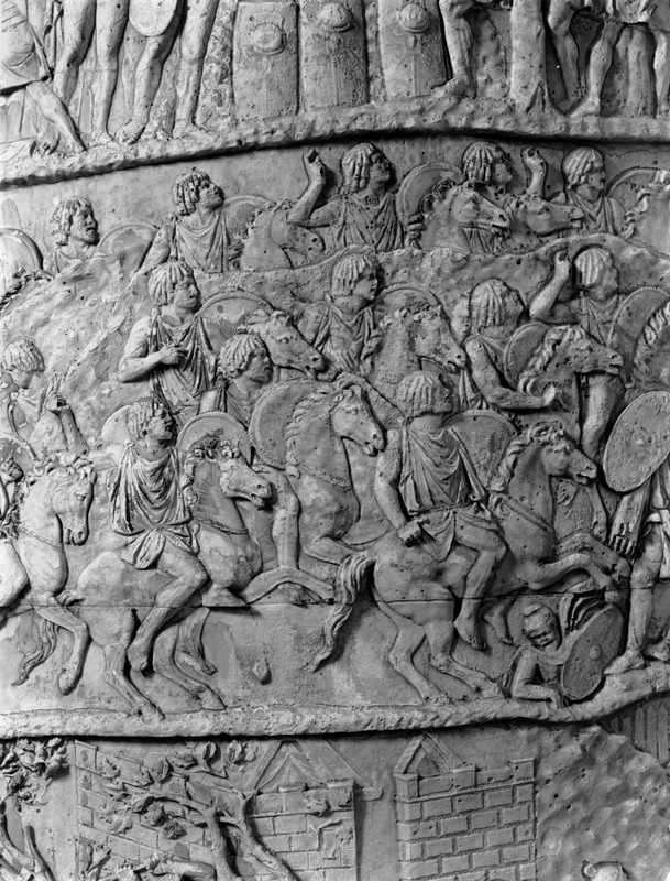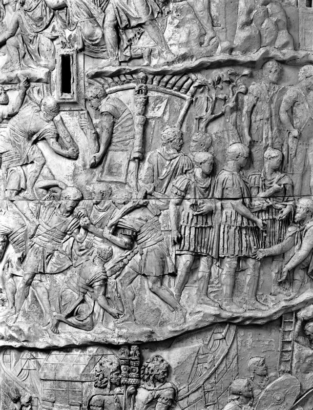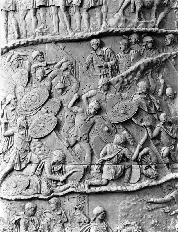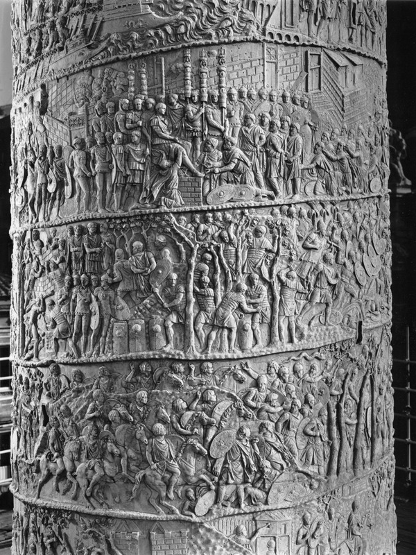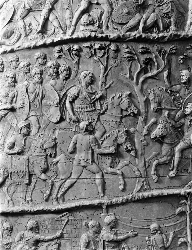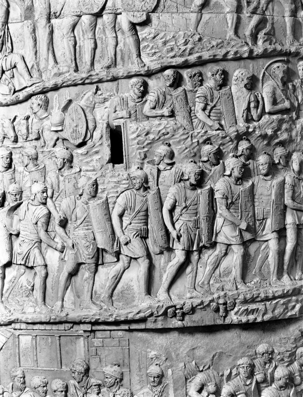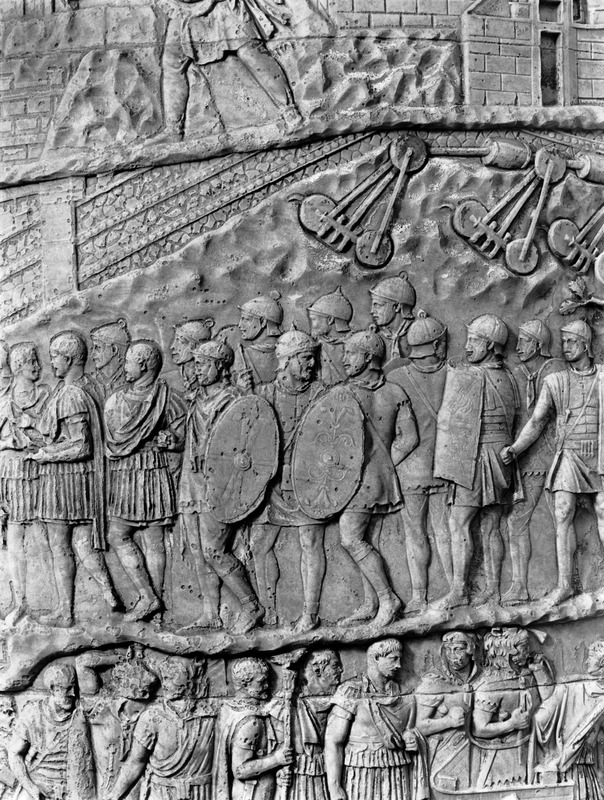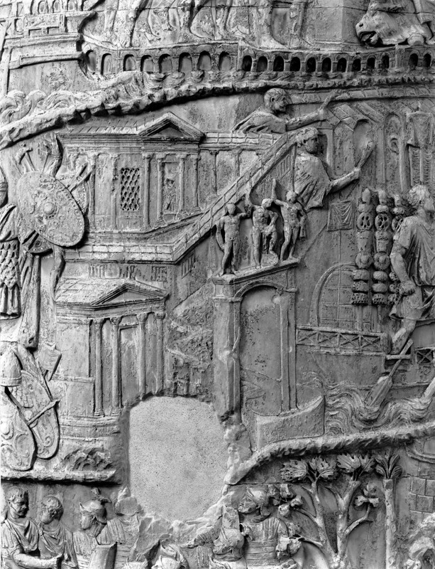 Roma - Foro Traiano, Colonna Traiana, a sinistra, legionari romani mentre mietono il grano e lo caricano su dei muli. Al centro, ausiliari romani mandati in avanscoperta, osservano, nascosti tra gli alberi di una foresta, le mura di una città dace, identificata con la capitale Sarmizegetusa Regia. Al suo interno (a destra) si scorgono alcuni daci pileati in grande agitazione a causa dell'avanzata romana. All'esterno delle mura, alcuni guerrieri daci osservano il terreno e discutono su dove porre le fortificazioni a protezione della loro capitale (tavole LXXXI-LXXXII)