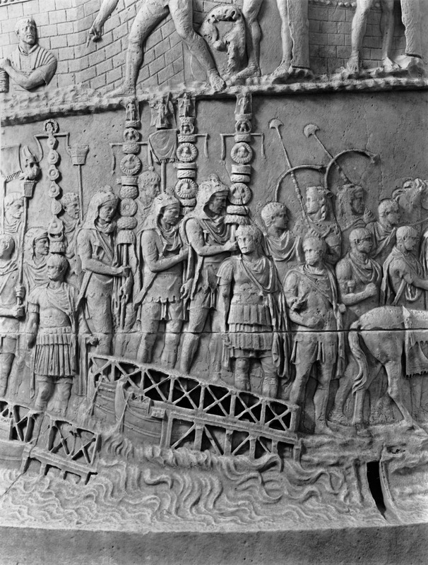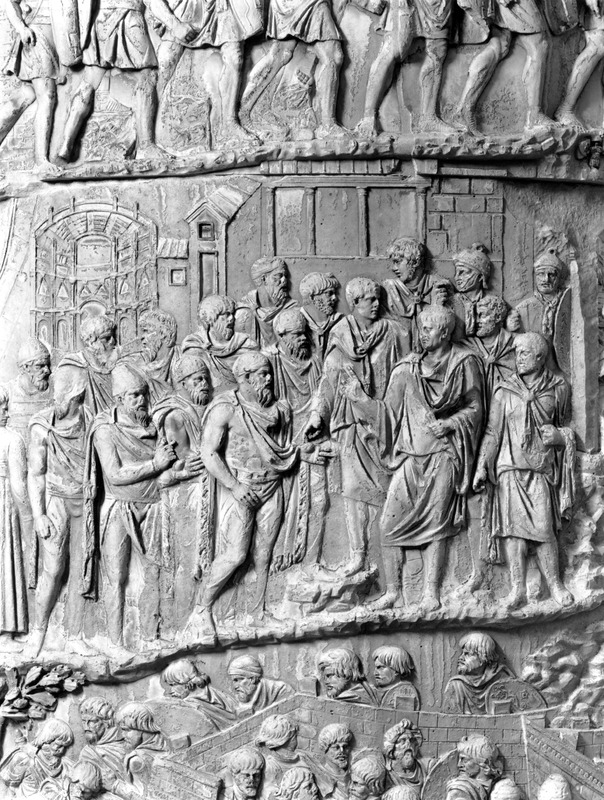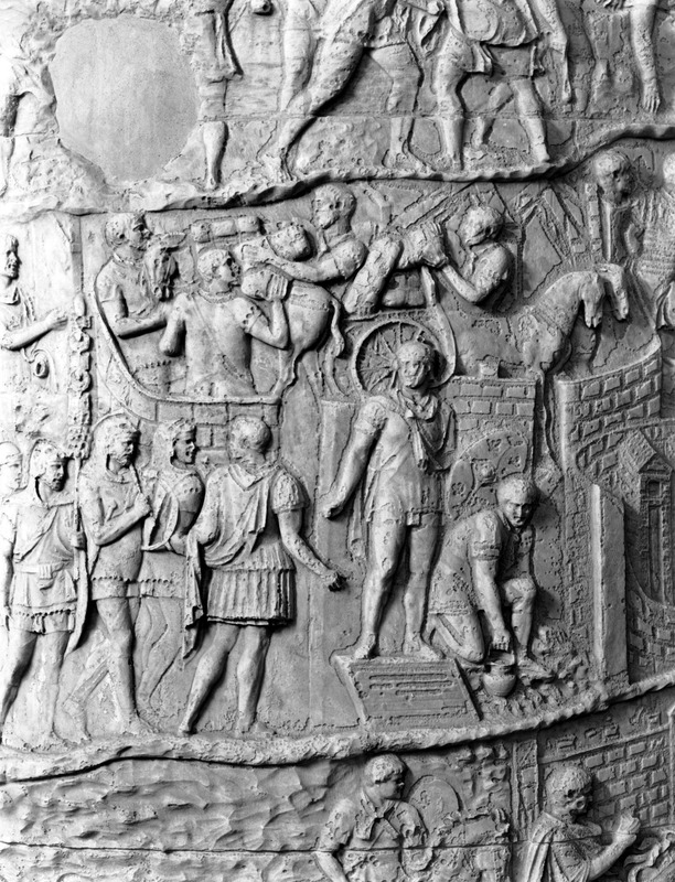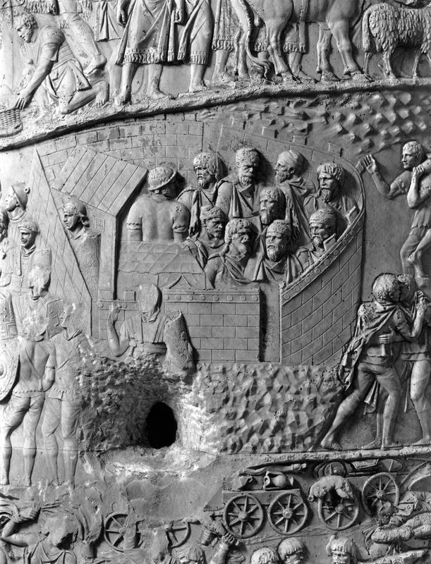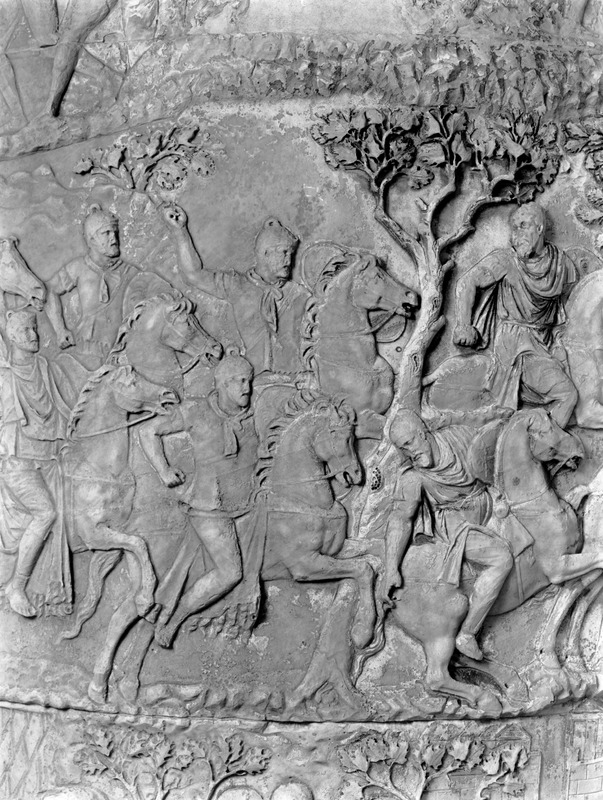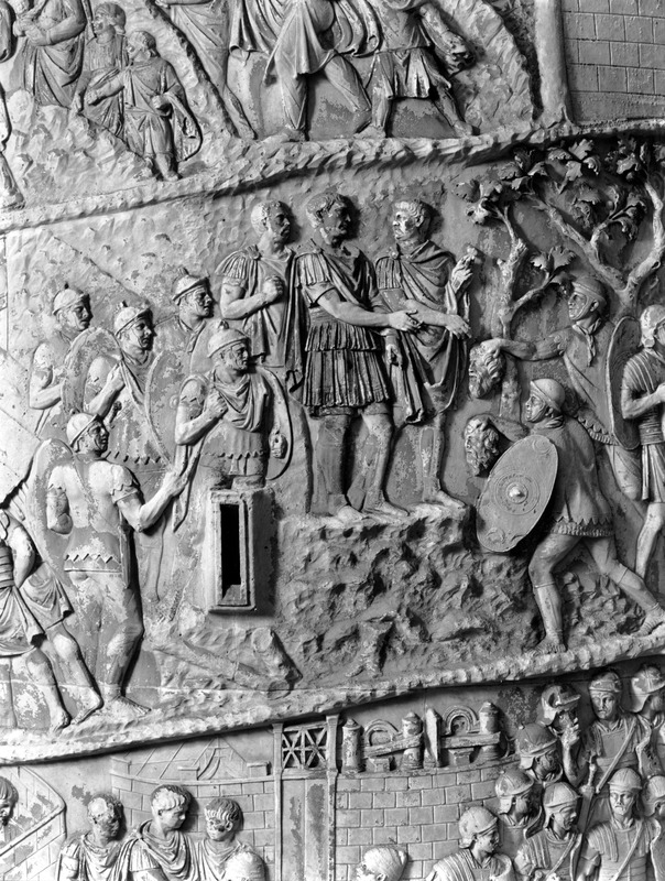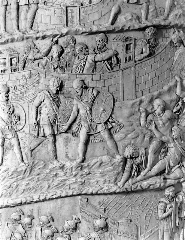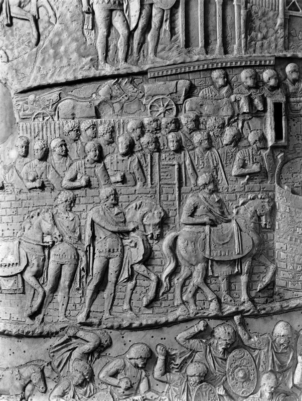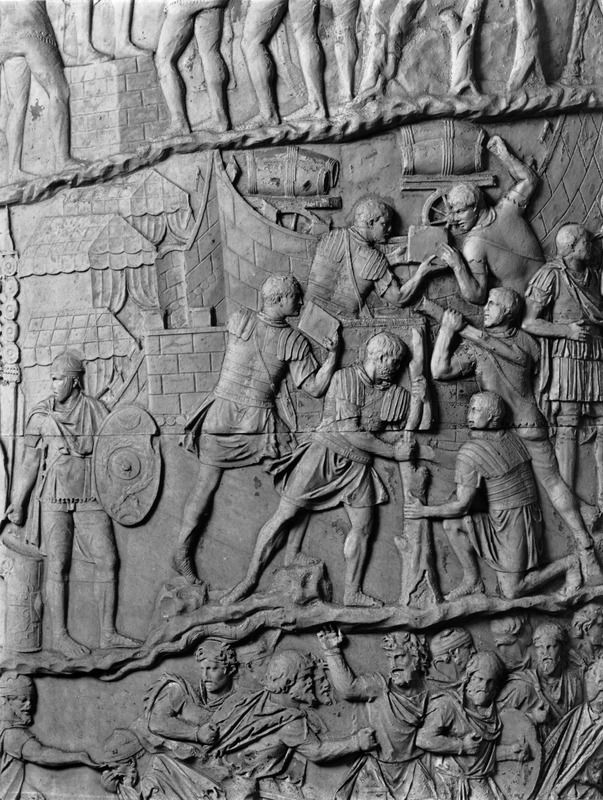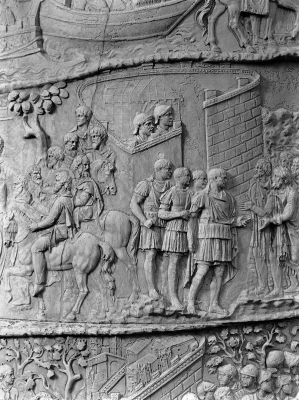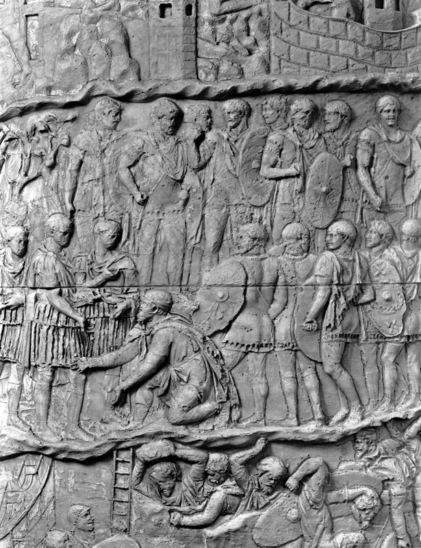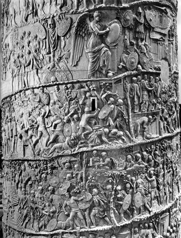 Roma - Foro Traiano, Colonna Traiana, a sinistra, legionari romani mentre mietono il grano e lo caricano su dei muli. Al centro, ausiliari romani mandati in avanscoperta, osservano, nascosti tra gli alberi di una foresta, le mura di una città dace, identificata con la capitale Sarmizegetusa Regia. Al suo interno (a destra) si scorgono alcuni daci pileati in grande agitazione a causa dell'avanzata romana. All'esterno delle mura, alcuni guerrieri daci osservano il terreno e discutono su dove porre le fortificazioni a protezione della loro capitale (tavole LXXXI-LXXXII)