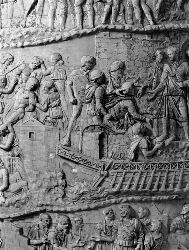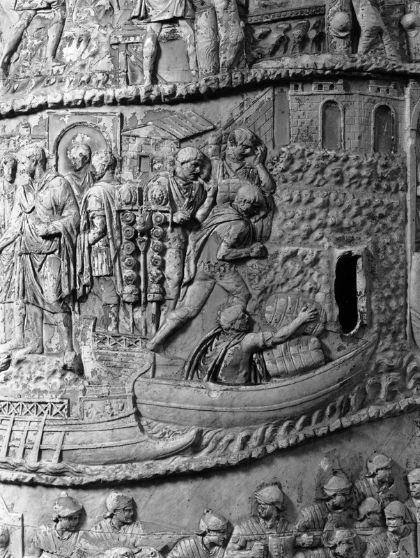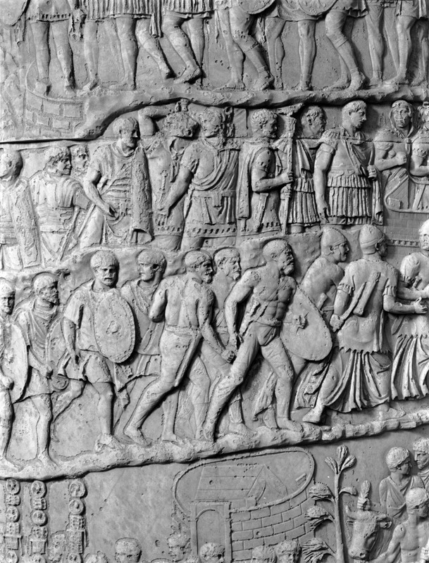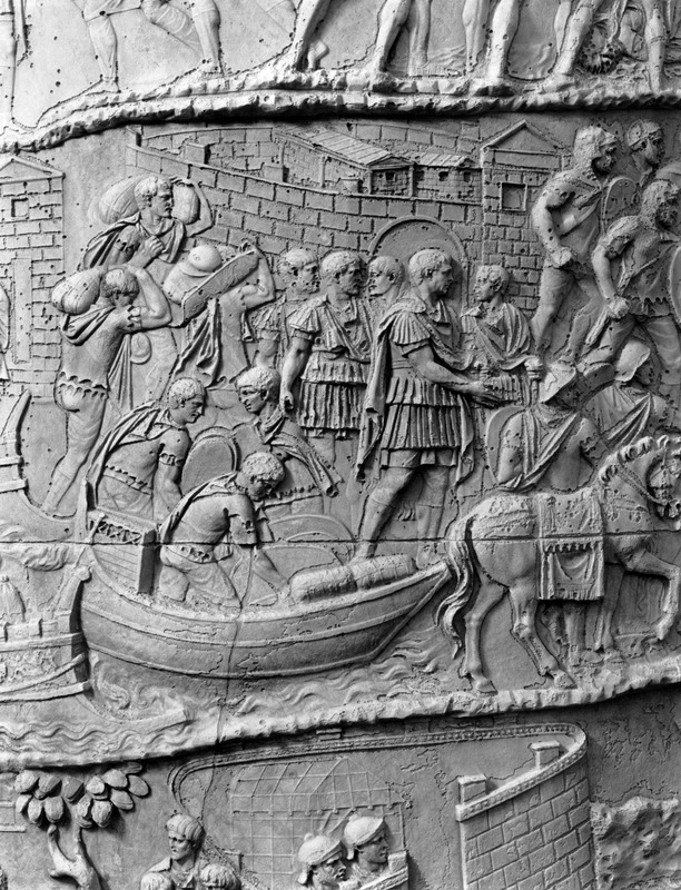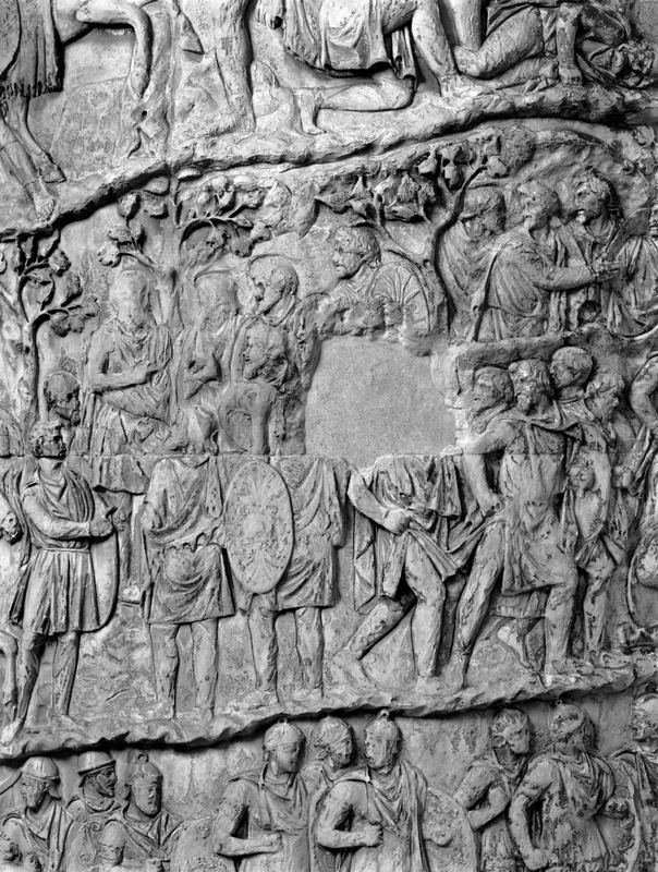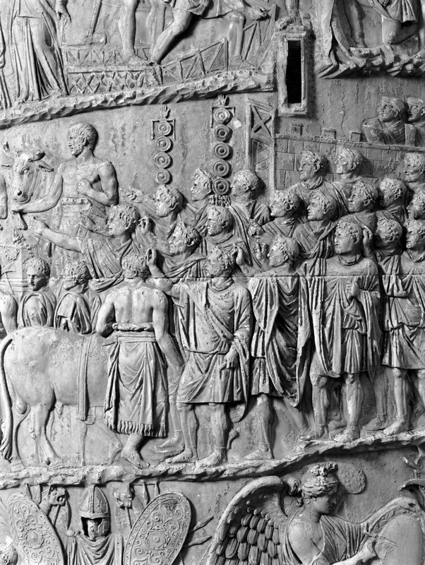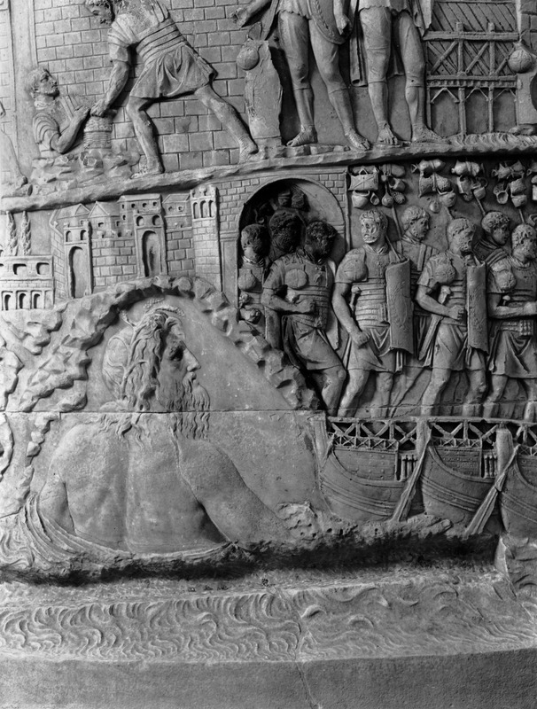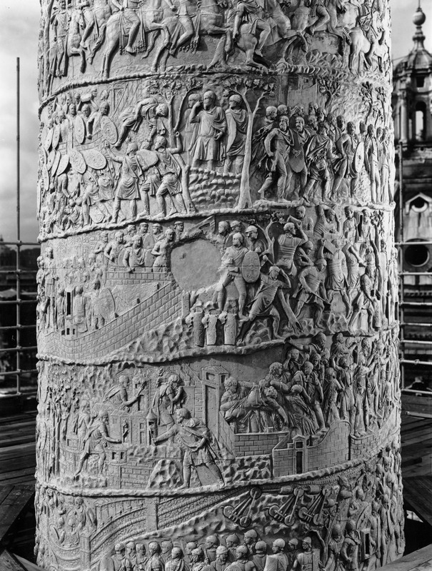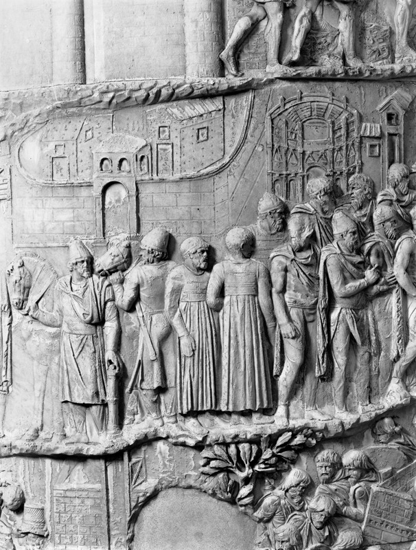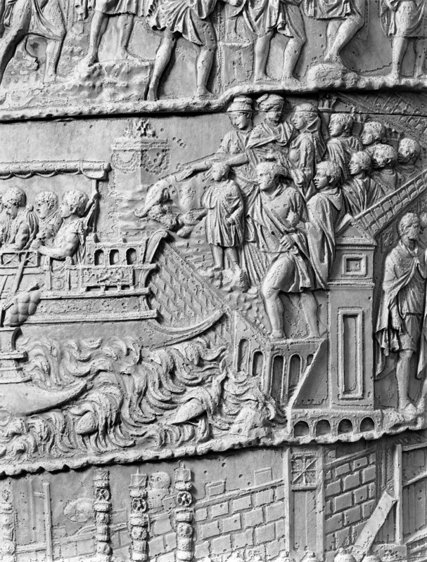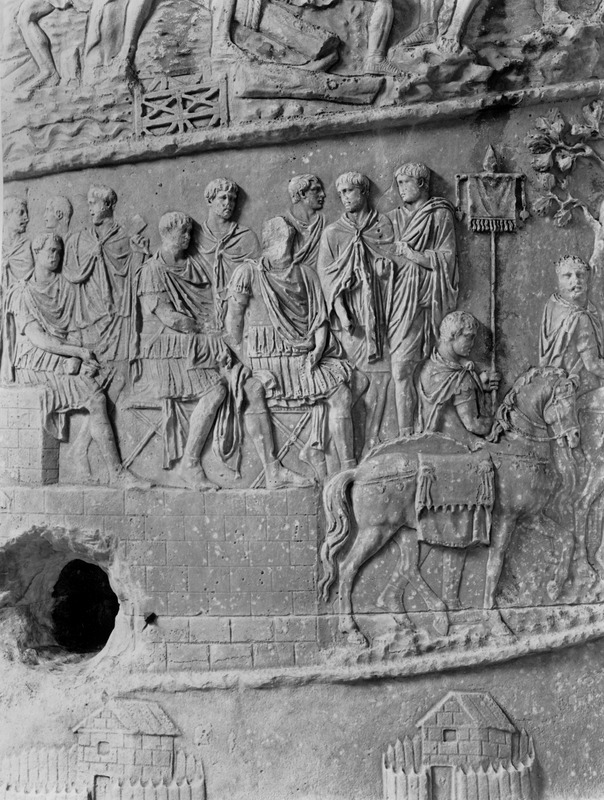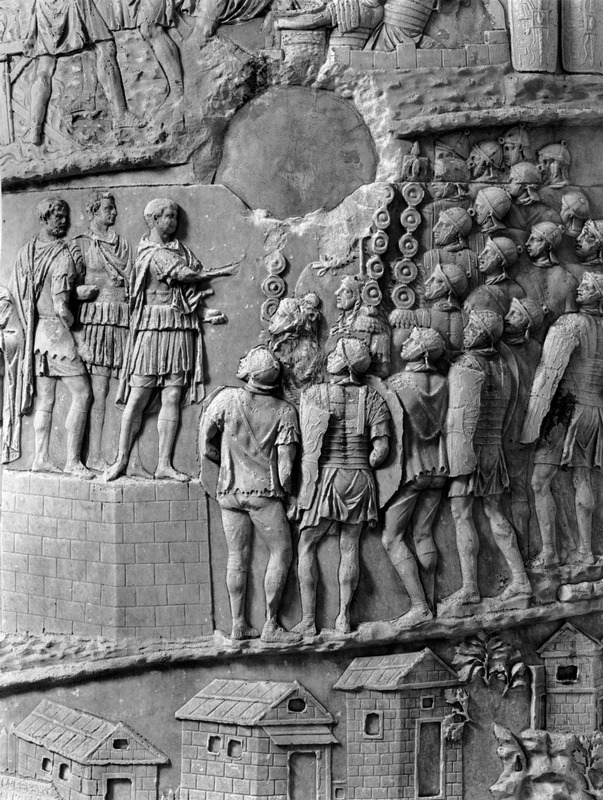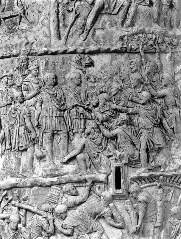 Roma - Foro Traiano, Colonna Traiana, a sinistra, legionari romani mentre mietono il grano e lo caricano su dei muli. Al centro, ausiliari romani mandati in avanscoperta, osservano, nascosti tra gli alberi di una foresta, le mura di una città dace, identificata con la capitale Sarmizegetusa Regia. Al suo interno (a destra) si scorgono alcuni daci pileati in grande agitazione a causa dell'avanzata romana. All'esterno delle mura, alcuni guerrieri daci osservano il terreno e discutono su dove porre le fortificazioni a protezione della loro capitale (tavole LXXXI-LXXXII)
