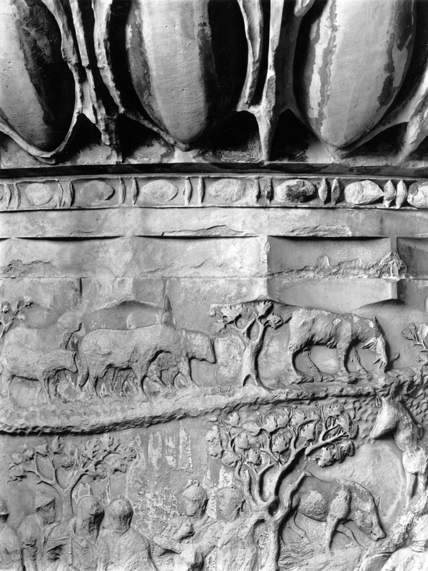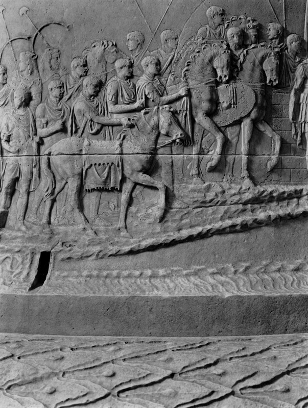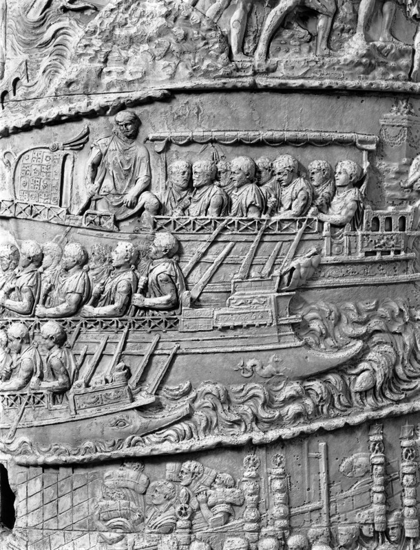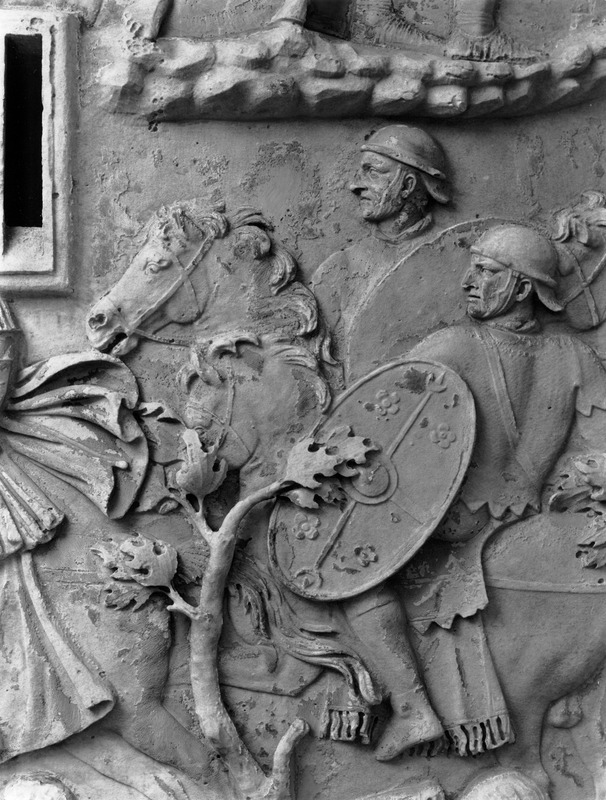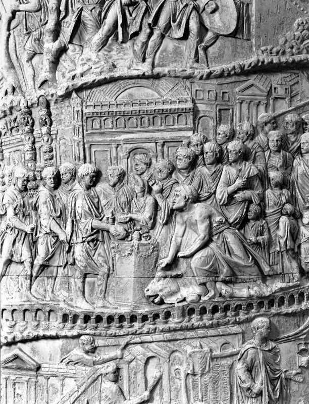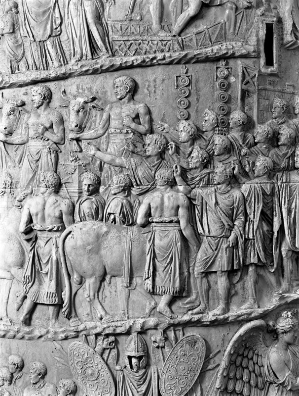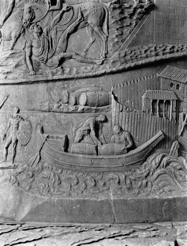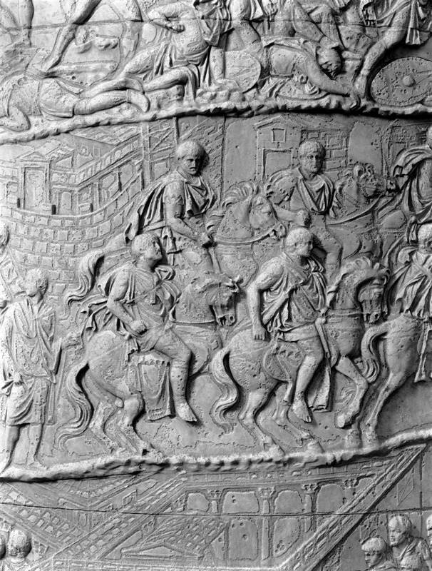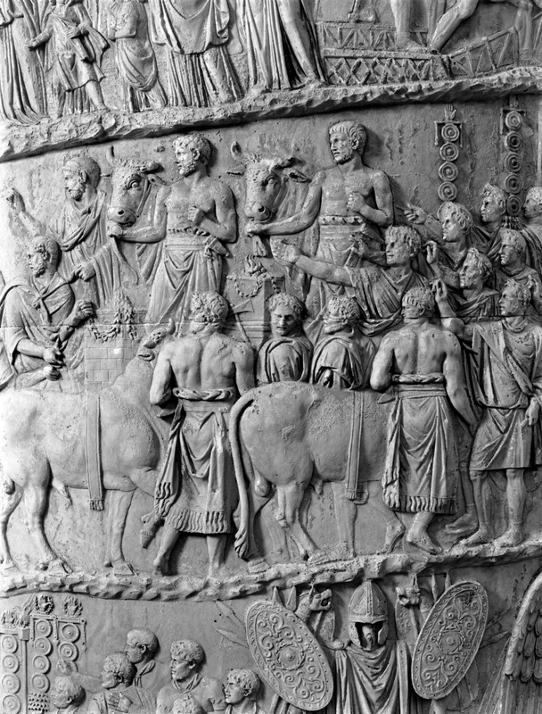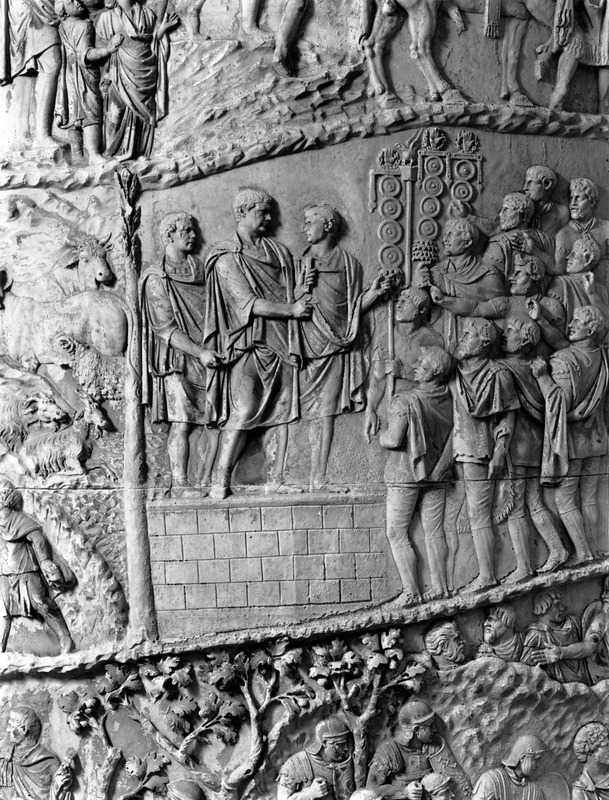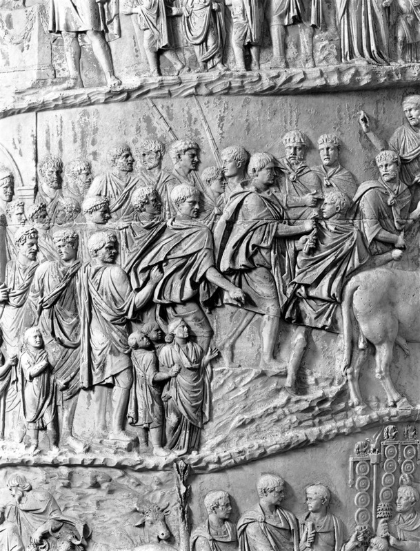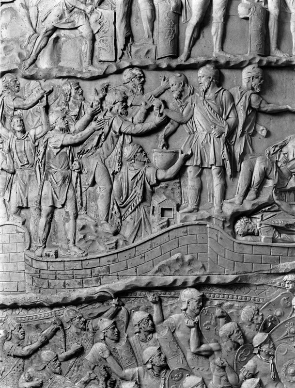 Roma - Foro Traiano, Colonna Traiana, a sinistra, legionari romani mentre mietono il grano e lo caricano su dei muli. Al centro, ausiliari romani mandati in avanscoperta, osservano, nascosti tra gli alberi di una foresta, le mura di una città dace, identificata con la capitale Sarmizegetusa Regia. Al suo interno (a destra) si scorgono alcuni daci pileati in grande agitazione a causa dell'avanzata romana. All'esterno delle mura, alcuni guerrieri daci osservano il terreno e discutono su dove porre le fortificazioni a protezione della loro capitale (tavole LXXXI-LXXXII)