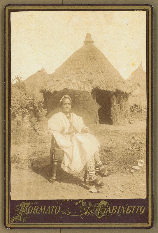 Africa - Indigeni; Uomo - Ritratti. Esterno/giorno. Un giovane uomo africano è ritratto a figura intera seduto su una sedia davanti all'ingresso di una capanna. Indossa abiti tradizion ali e tiene nella mano un ombrello aperto..