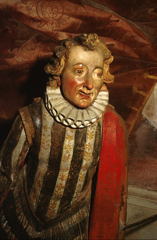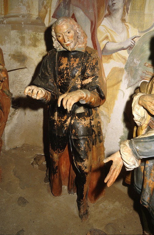 Orta San Giulio - Sacro Monte - Cappella XVII - Interno - La morte di S. Francesco - Il Santo, prossimo alla morte, si corica nudo a terra; attorno a lui i frati, Jacopa de' Settesoli e S. Chiara - Part.: gentiluomo - Statue in terracotta policrome - Sec. XVII/ fineDi Carlo, AntonioGabinetto Fotografico Nazionale