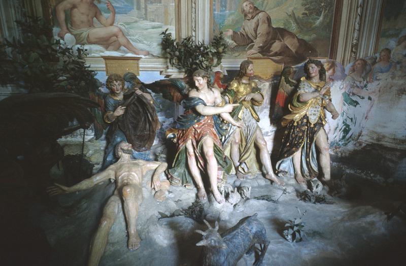 Orta San Giulio - Sacro Monte - Cappella X - Interno - La vittoria di S. Francesco sulle tentazioni - S. Francesco, oggetto di una tentazione carnale, si getta, nudo, in gennaio, fra i rovi di un roseto - Part.: il Santo e gli angeli - Statue in terracotta policrome - 1661Di Carlo, AntonioGabinetto Fotografico Nazionale