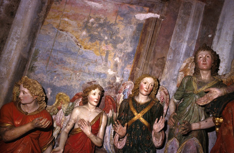 Orta San Giulio - Sacro Monte - Cappella XI - Interno - S. Francesco ottiene da Gesù il privilegio dell'indulgenza della Porziuncola - Sull'altare siedono Gesù e Maria tra un corteggio di angeli - Part.: angeli - Statue in terracotta policrome - 1617Di Carlo, AntonioGabinetto Fotografico Nazionale