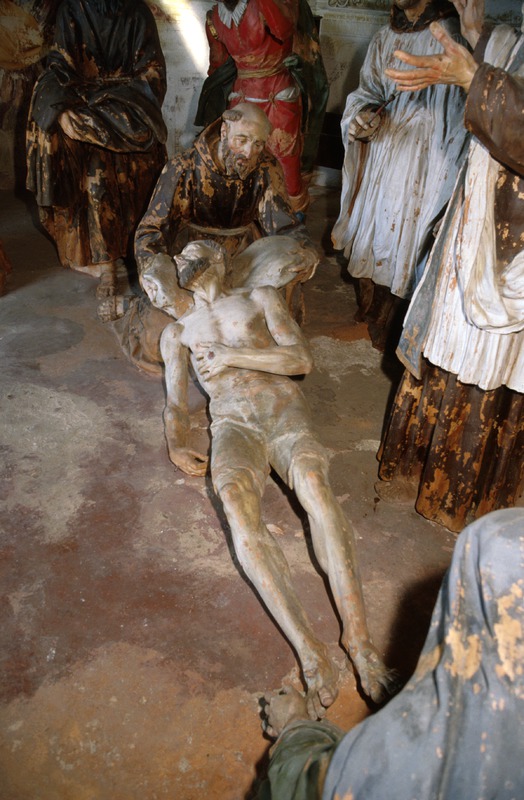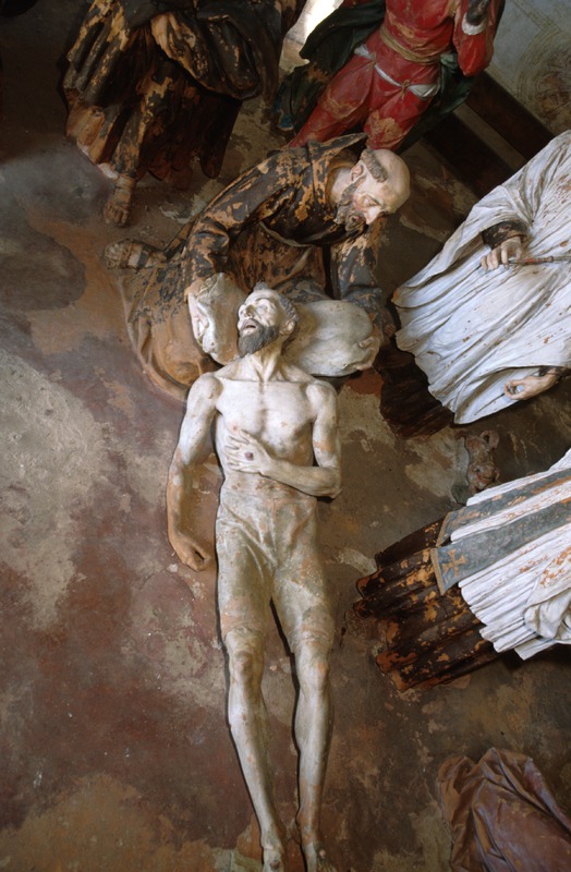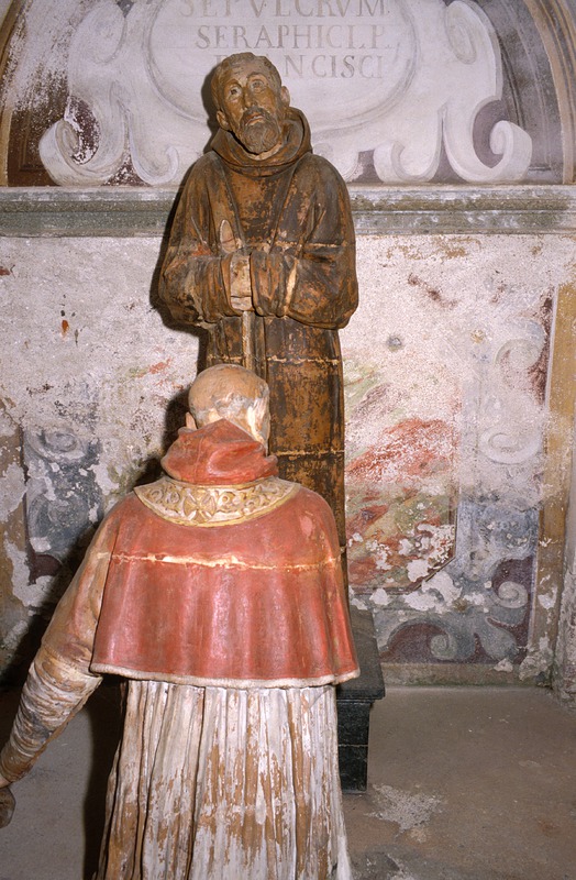 Orta San Giulio - Sacro Monte - Cappella XVIII - Interno - Nicolò III, un vescovo ed il segretario sulla tomba del Santo - Part.: il pontefice trova il corpo del Santo in piedi, dalle stigmate esce sangue - Statue in terracotta policrome - 1624Di Carlo, AntonioGabinetto Fotografico Nazionale