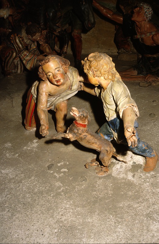 Orta San Giulio - Sacro Monte - Cappella XVI - Interno - S. Francesco torna ad Assisi dalla Verna poco prima di morire; la folla si schiera al passaggio del Santo stigmatizzato - Part.: due fanciulli ed un cane - Statue in terracotta policrome - Sec. XVII/ fineDi Carlo, AntonioGabinetto Fotografico Nazionale