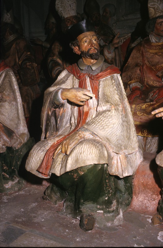 Orta San Giulio - Sacro Monte - Cappella XX - Interno - La canonizzazione di S. Francesco - Gregorio IX consegna al cardinale la bolla di canonizzazione; vi assistono ecclesiastici ed ambasciatori - Part.: ecclesiastico - Statue in terracotta policrome - 1678Di Carlo, AntonioGabinetto Fotografico Nazionale