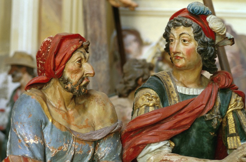 Orta San Giulio - Sacro Monte - Cappella XIII - Interno - S. Francesco, per umiltà, si fa condurre nudo per le vie di Assisi; nobili, popolani, cavalieri, assistono alla scena - Part.: soldato e popolano - Statue in terracotta policrome - 1698Di Carlo, AntonioGabinetto Fotografico Nazionale